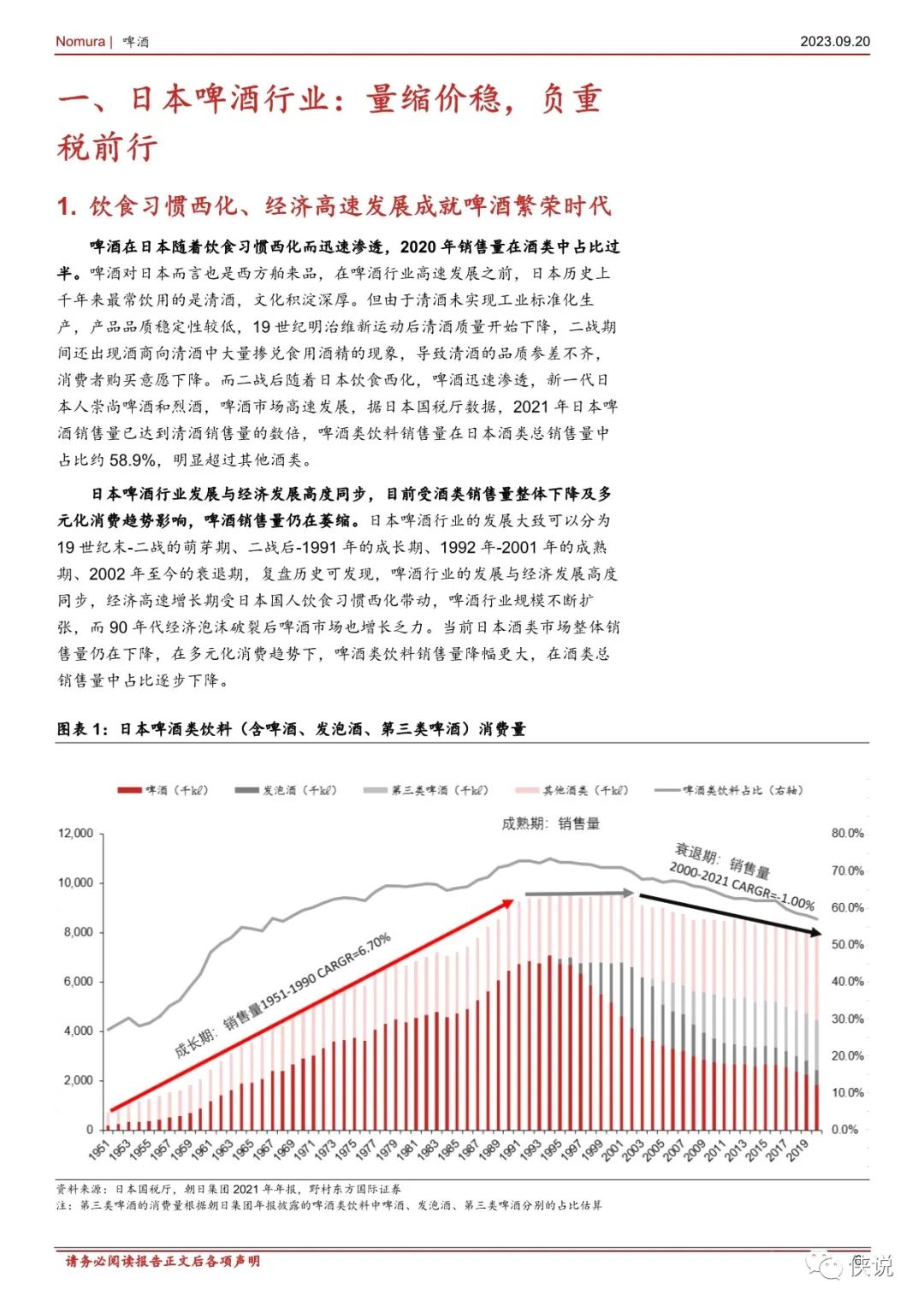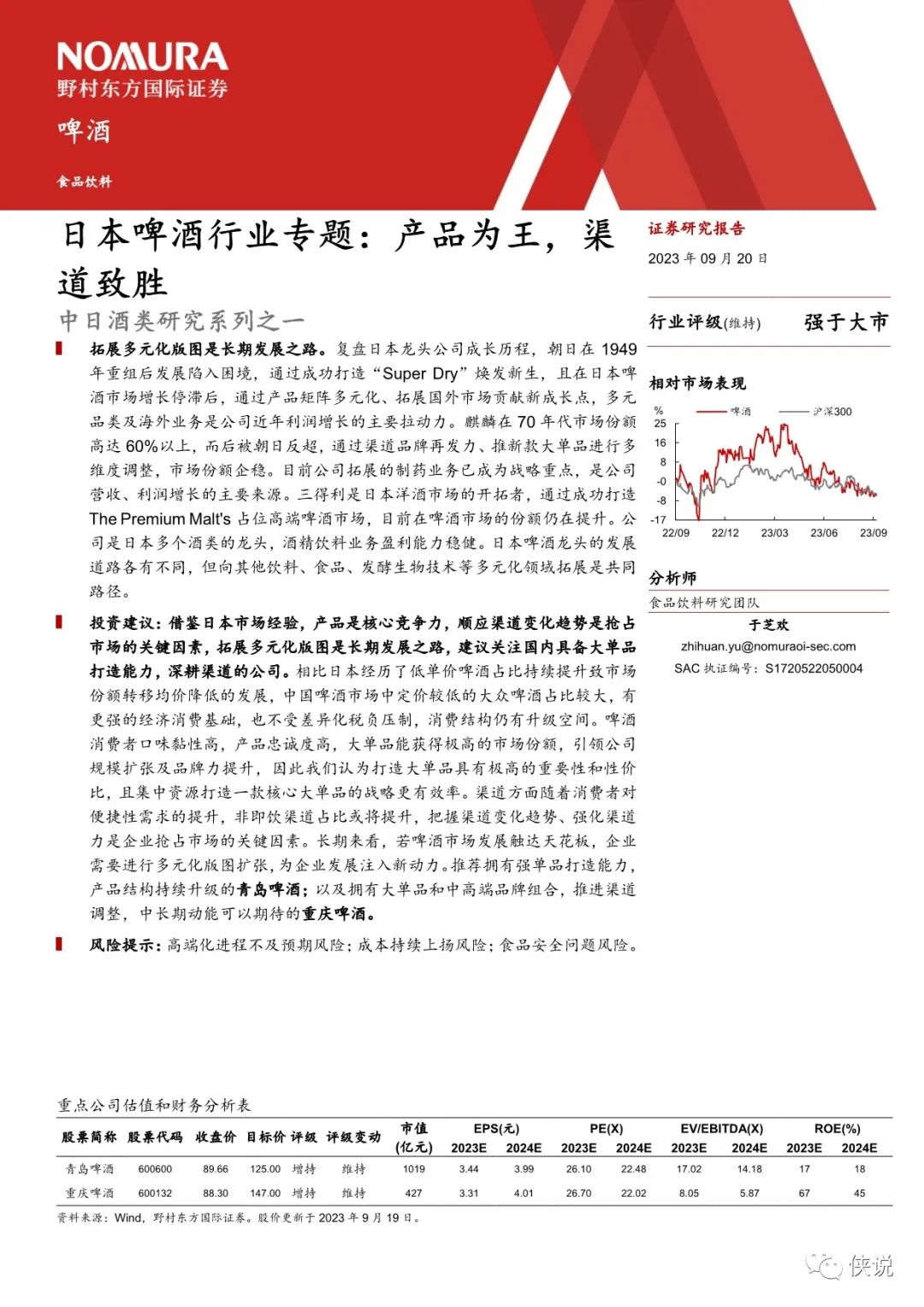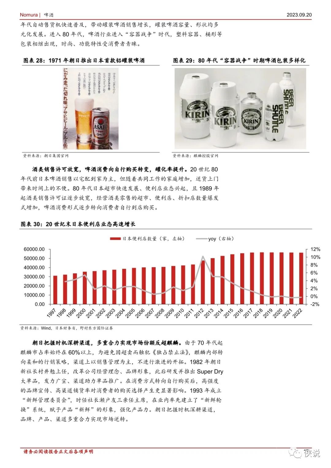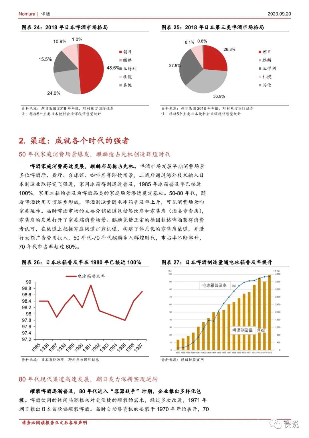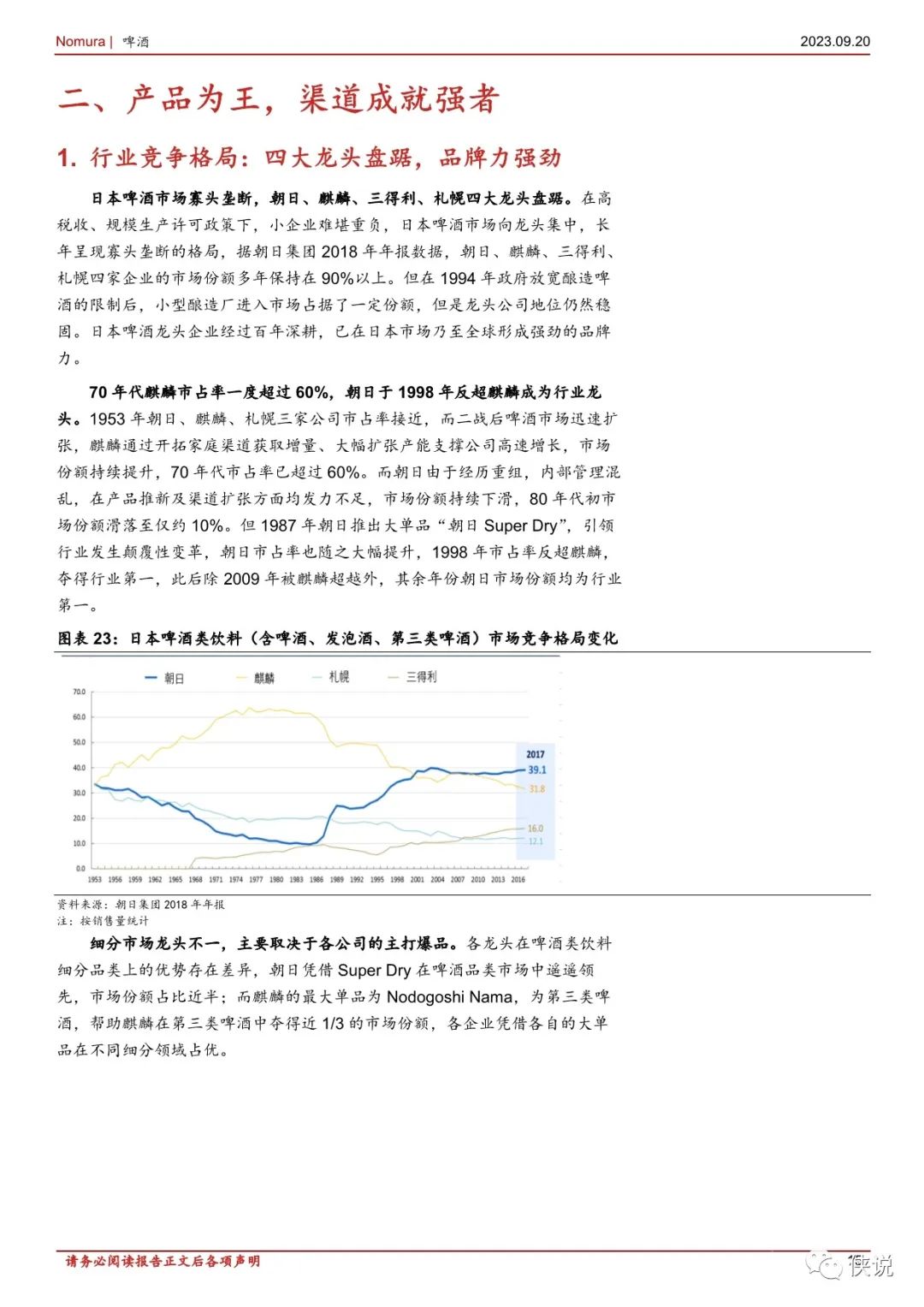 渠道制胜: 把握变化先机,成就时代强者。20 世纪 50 年代日本啤酒市场家庭消费端高速发展,麒麟把握住家庭渠道扩容的机遇,70 年代市占率达到60%以上。80 年代日本啤酒消费方式从宅配到家向到店购买转变,朝日发力渠道,推出的罐装 SuperDry 适配渠道转变,最终实现市场份额逆转。我们认为抢占渠道变化先机的公司能充分享受渠道扩容红利,成为时代的强者。单品为王:大爆品的打造具有颠覆效果。