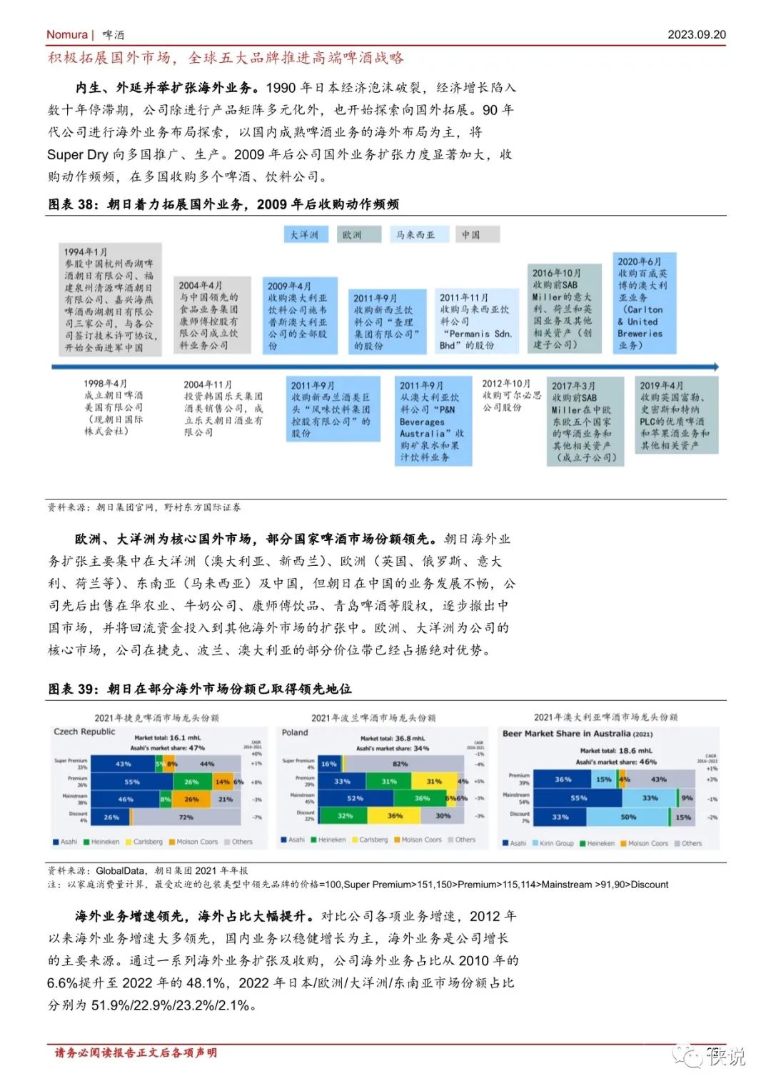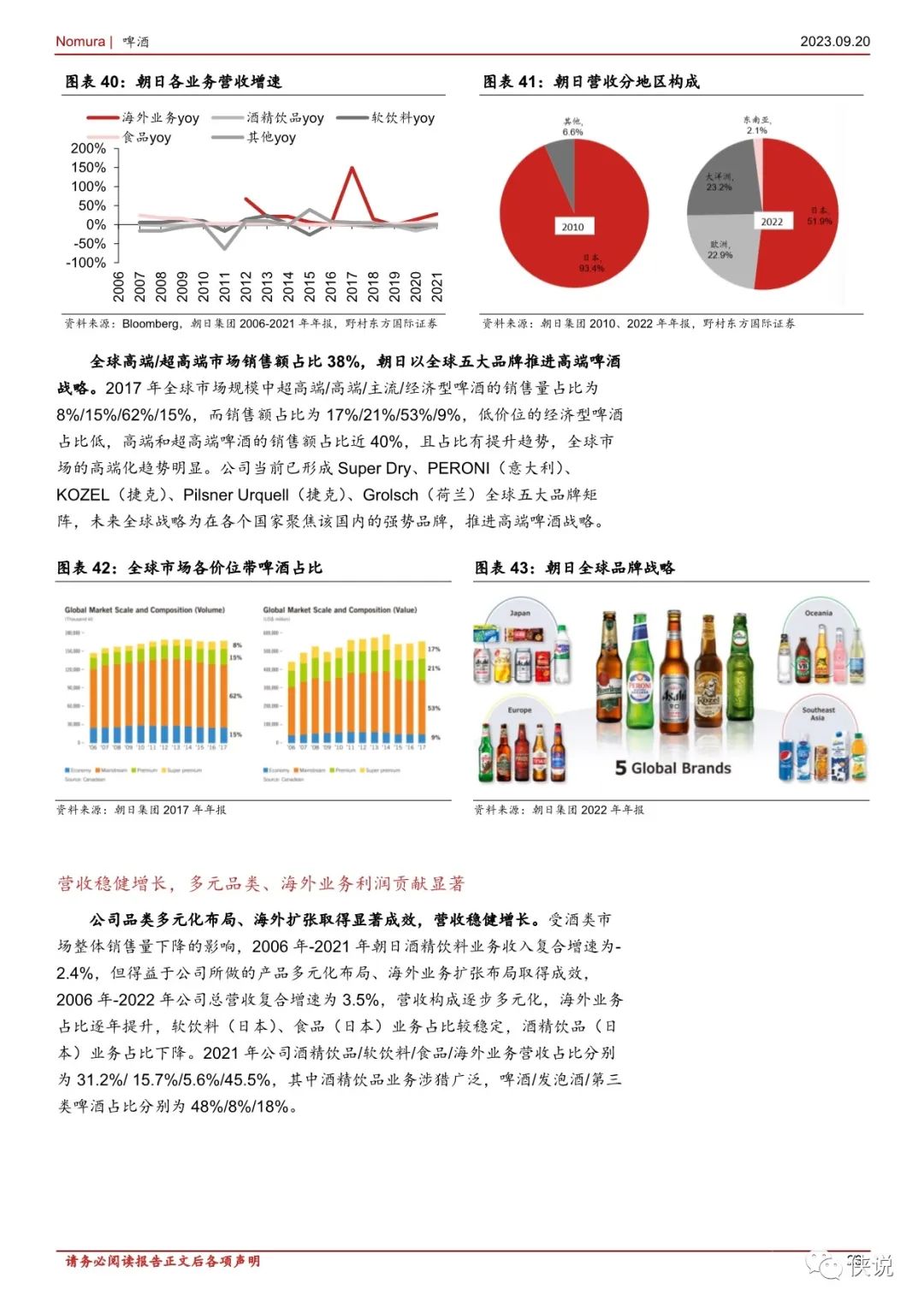 拓展多元化版图是长期发展之路。复盘日本龙头公司成长历程,朝日在 1949年重组后发展陷入困境,通过成功打造“Super Dry”焕发新生,且在日本啤酒市场增长停滞后,通过产品矩阵多元化、拓展国外市场贡献新成长点,多元品类及海外业务是公司近年利润增长的主要拉动力。