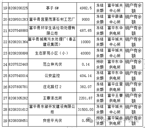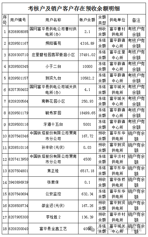 国网富平县供电公司对2023年12月前已销户电力用户电费余额清退工作,并持续开展以前年度预缴账款的清退工作。目前通过在供电营业厅张贴公告、电话、短信告知等方式通知用户积极办理清退业务,但由于客户号码变更等原因,仍存在部分用户的清退未完成,请看到公告的用户积极联系当地营业厅,提供必备资料,办理退费或余额结转手续(余额结转为将已销户余额结转至目前用电户电费余额中)。如在2024年4月30日之前未将资料递交,公司将按照账务处理规定,进行账务处理。