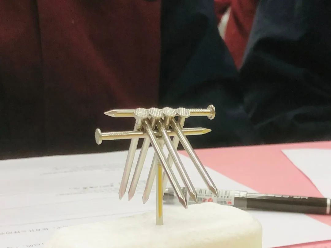 1.要求:除手之外不能借助其他任何东西,你能把9根钉子放在1根立起来的钉帽上吗?(手要放开)