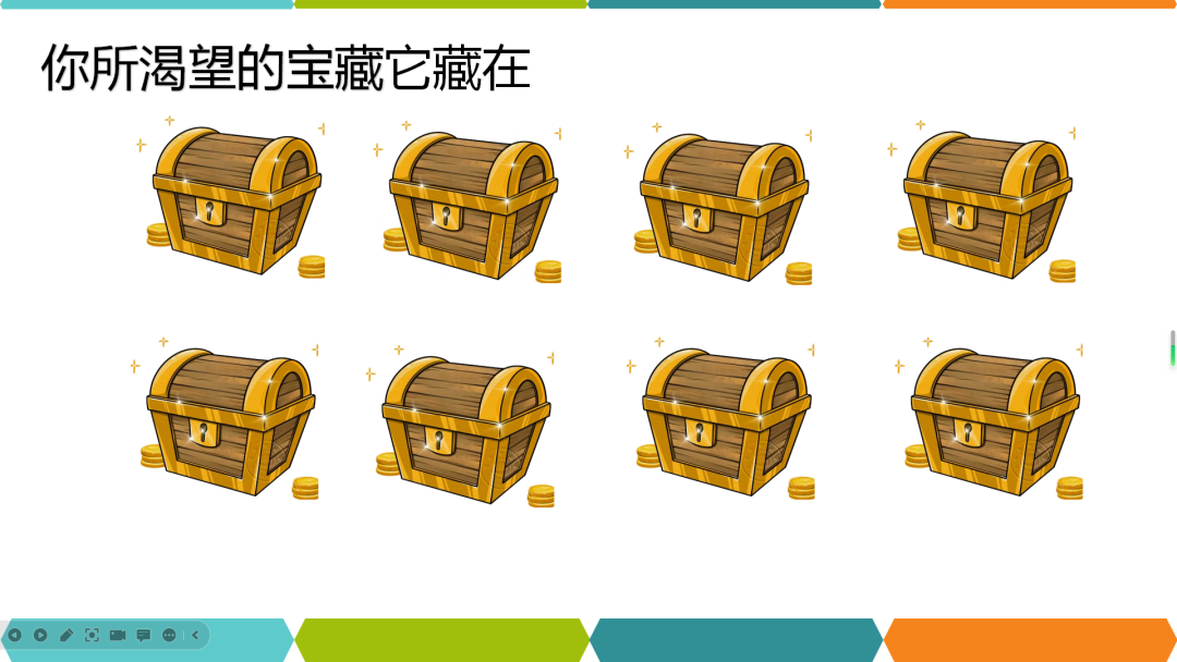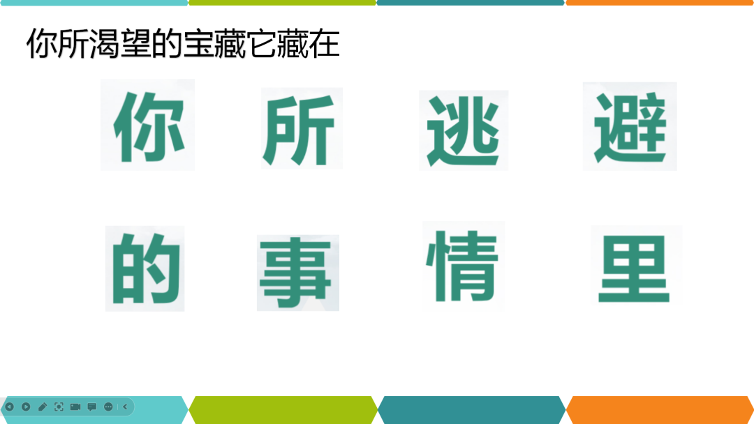 通过学生以上几个环节的优秀表现,成功获得了八个宝藏盒,现在大家一起揭开宝藏,原来宝藏是一句话——"你所渴望的宝藏它藏在你所逃避的事情里",