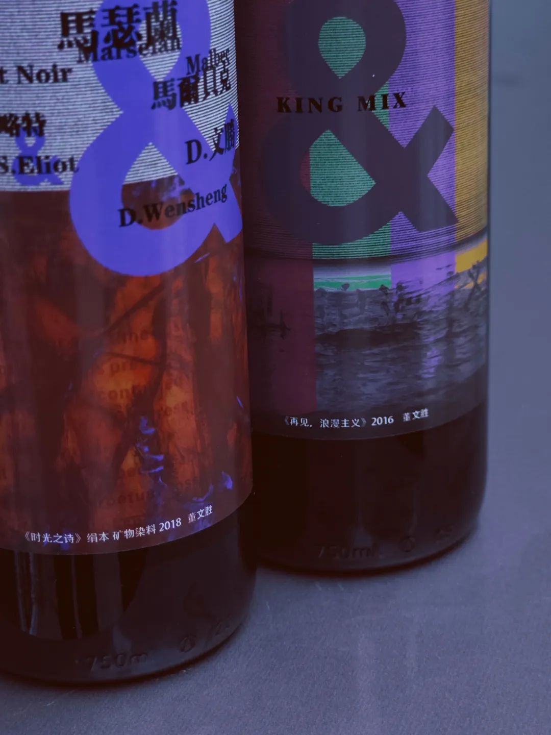 2023年7月,《中国风景》展览移至兰州,在那里第一次和文胜见面。11月,经历了三年变动的上海ART021和西岸艺博会如期举行。那几日,各地的艺术圈朋友大都聚集在上海,每天看展之后都会有各种的聚会。一日,在一家新疆风味的餐厅,策展人施瀚涛、艺术家马康和董文胜,还有我与妻子精灵聚在一起。当时我们带了几瓶贺兰山东麓葡萄酒请大家一起品尝。酒过三巡,聊到地域文化与饮食之间的关系。我们即兴笑谈,就以一款多种葡萄的混酿为例赋予其“帝国文化”的概念:三个原本盛产于不同大陆板块的葡萄品种,因为一个新产区的诞生而同时在一个酒庄种植,这在以陆权为中心的时代,唯有版图跨越洲际区隔,并兼容了多个异质文化的大帝国才能形成这种饮食结构。也许是这种与其作品共通的“多元并存”带来的触动,董文胜对“帝国混酿”的叙述很感兴趣,从上海回到银川没几天,就收到他的信息:用摄影作品《再见,浪漫主义》和绘画作品《时间之诗》两种不同媒介的作品设计酒标来做自己的联名款葡萄酒。