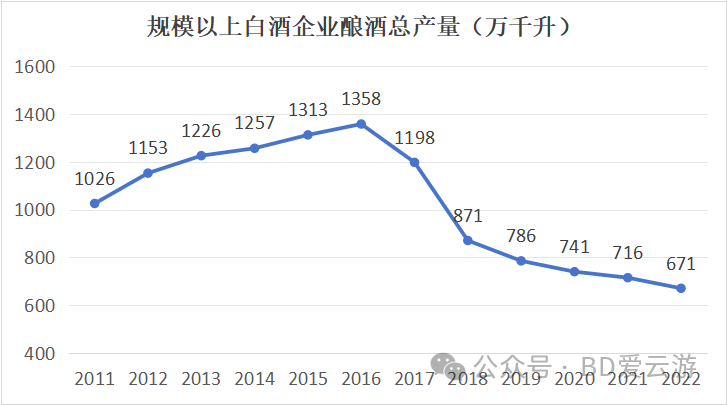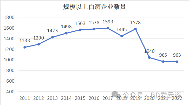 可以看出企业的数量和经济环境息息相关,2017年前缓慢上升,2018年大环境不好,下降一波。2019年之后,估计是疫情影响,企业数量断崖式下降。规模以上企业数量从2017年的高峰1593家,到2022年只剩下963家,四成的白酒企业已经倒下。在经济的寒冬中,竞争力弱的企业纷纷倒闭,白酒行业也不例外。