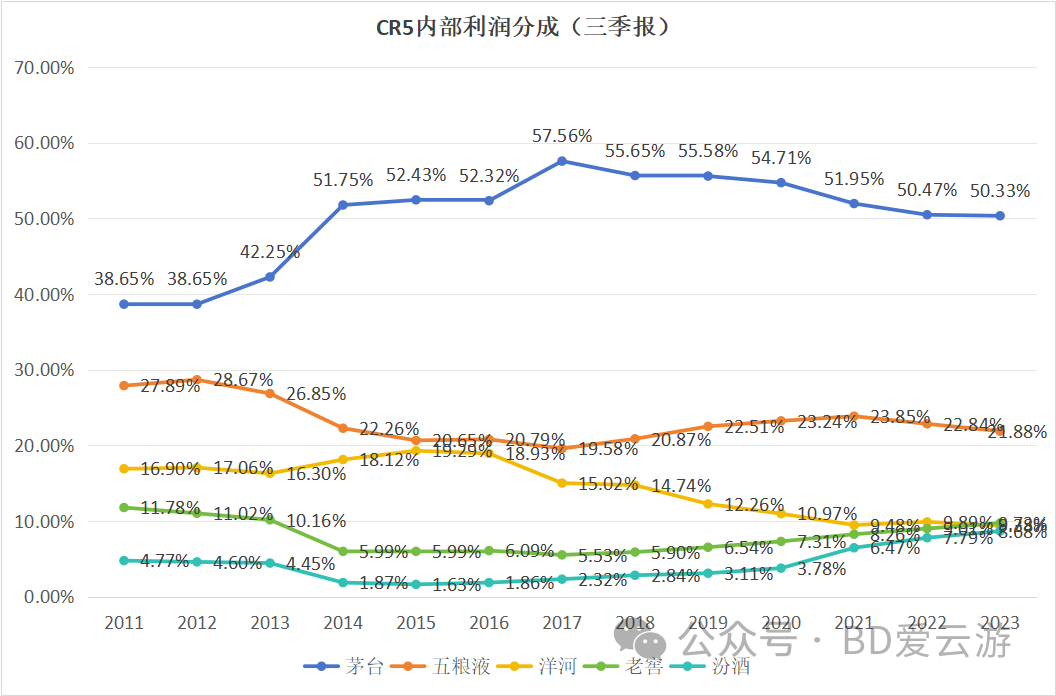CR5内部,按照同口径三季报来看,这种趋势也大差不差,份额增长的只有大哥茅台和基数低的汾酒,其余都在下降。当前茅台占一半50.33%,2017年以来每年都在下降,但已趋于平稳。五粮液占比21.88%,基本稳定。洋河老窖汾酒几乎平分剩下的约27%,已经到了短兵相接的地步。