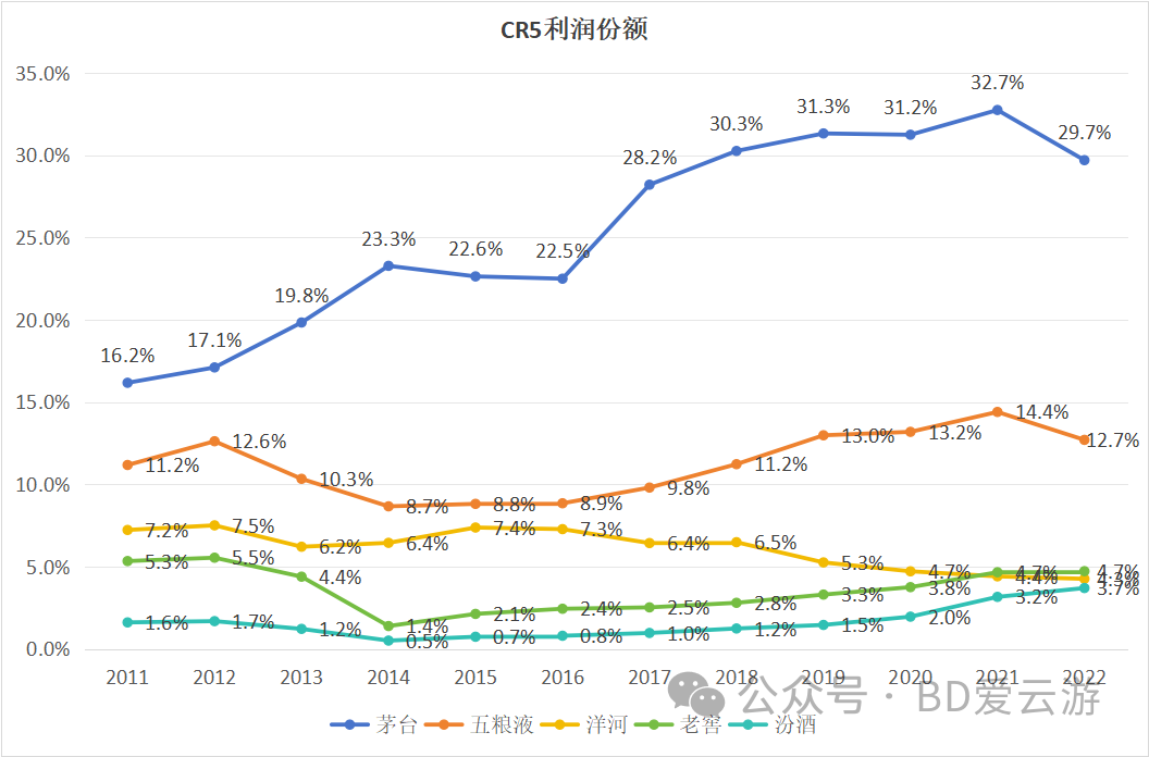 洋河利润占CR5份额:2012年17.06%,2022年9.89%,下降7.17个百分点。前边计算过洋河利润占白酒行业总份额同期下降了3.25个百分点。可以理解为来自茅台的压力,洋河向下传导了约一半,其余的自己承受。