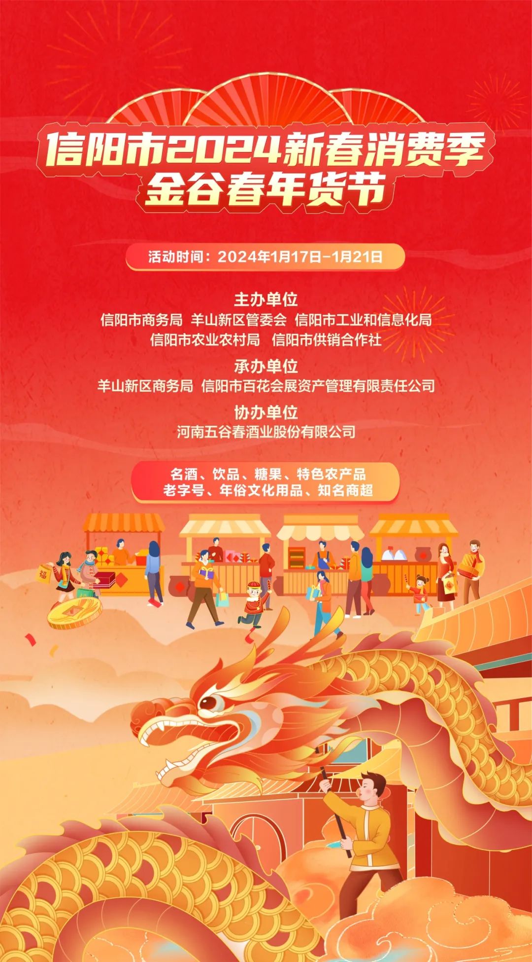 本届年货节旨为进一步扩大内需、提振消费,丰富市民节日生活,以“信阳市2024新春消费季金谷春年货节”为主题,启动新春消费季,培育信阳消费热点,丰富信阳市民春节物质文化生活,释放消费潜力,引领消费潮流,打造消费名片,扩大我市优秀名优特相关产品的销售,从而满足民众春节消费需求,达到助企惠民的效果。