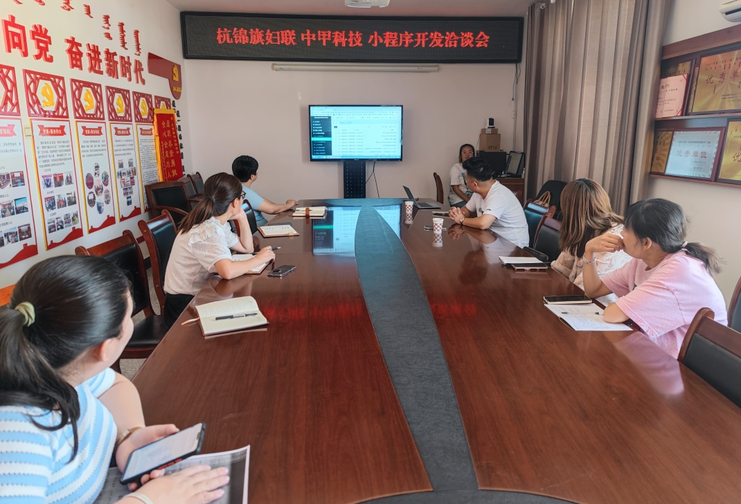 7月6日,杭锦旗妇联与内蒙古中甲科技有限责任公司在旗妇联召开“巾帼杭锦”小程序开发洽谈会。