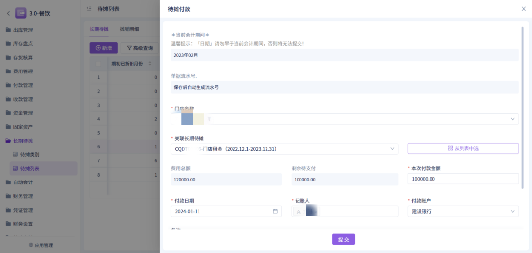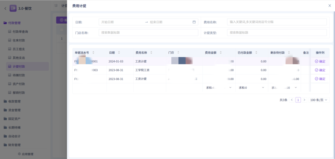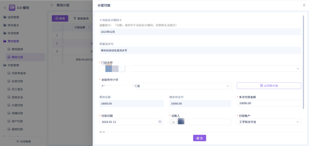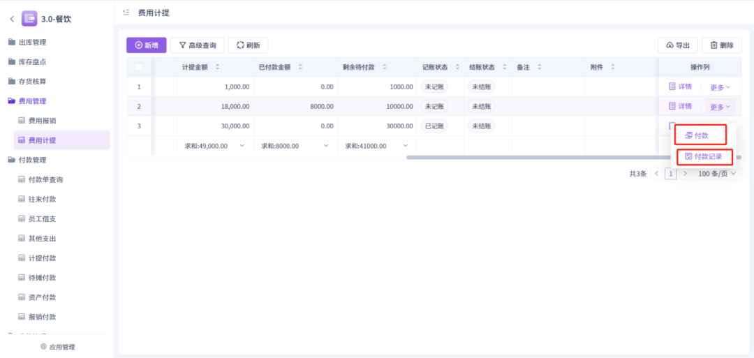 3、暂估和计提费用可以入账。费用计提功能单条数据支出查看往期付款记录,且提供快捷付款按钮;