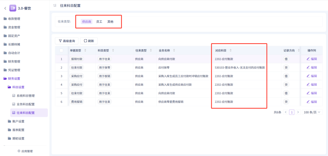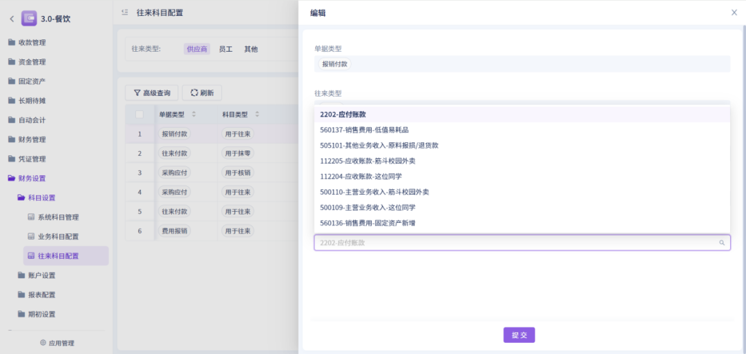 6、「科目设置-往来科目配置」新增往来科目配置功能,用户可自定义调整业务单据对应的往来科目;