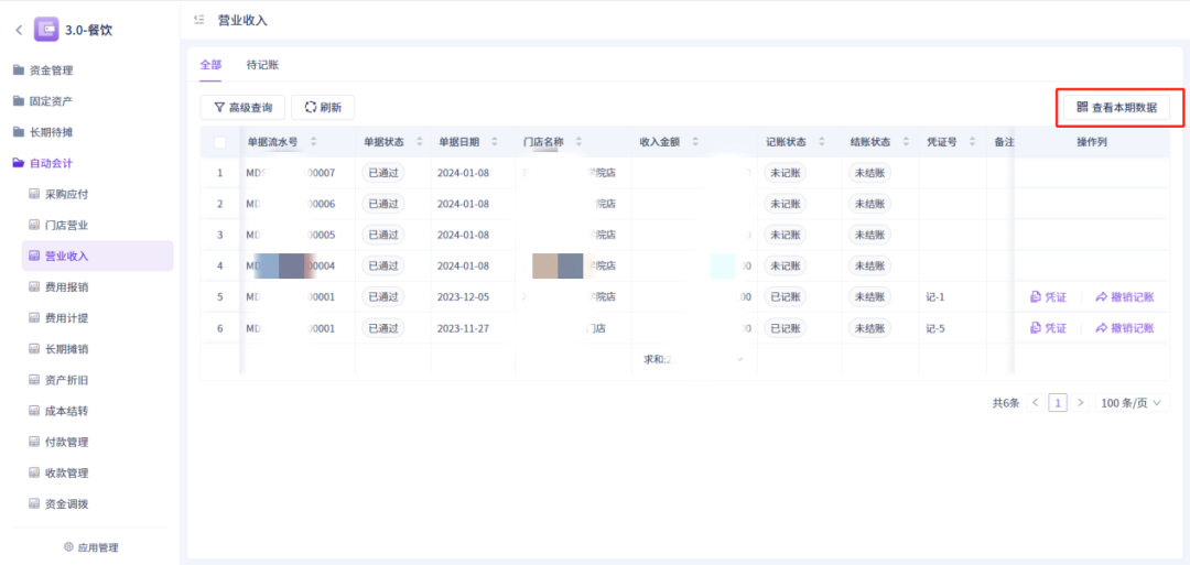 点击查看本期数据,则过滤显示当期的所有表单数据(待记账也有对应快捷过滤)
