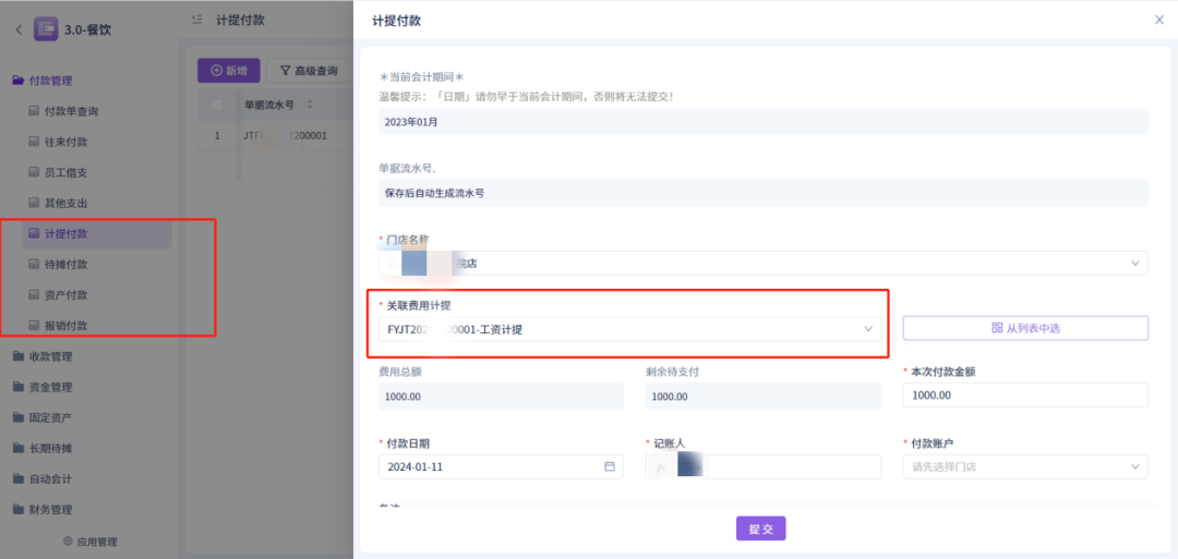 点击付款自动生成对应的计提付款单(付款记录须有付款才会显示)