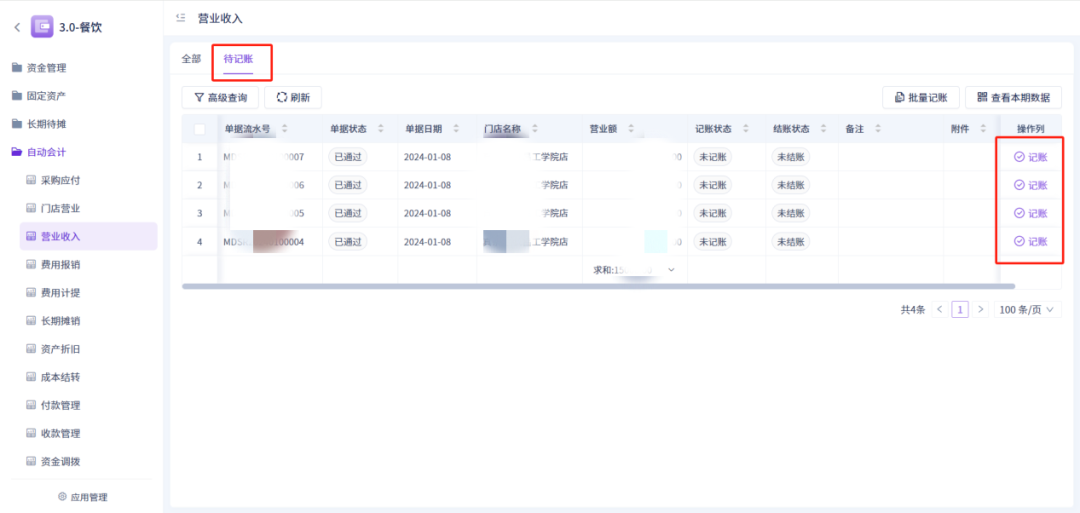 待记账中均可查看对应业务单据未记账数据,提交的业务单据均在该界面手动记账。