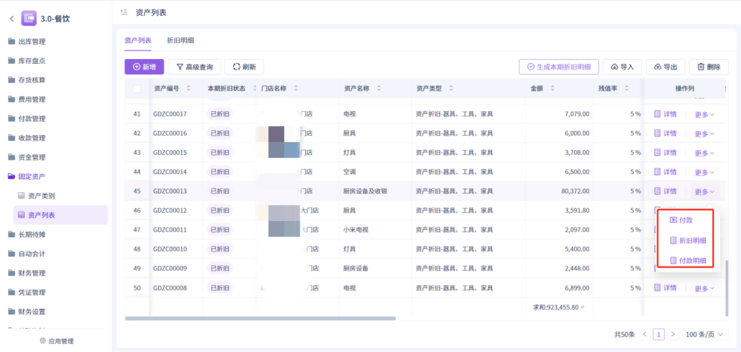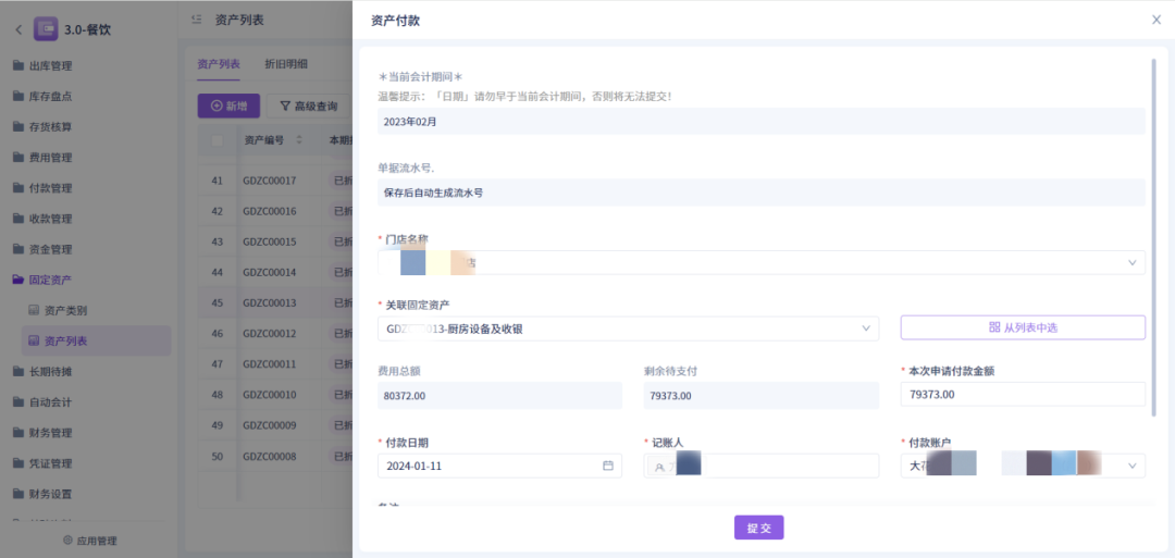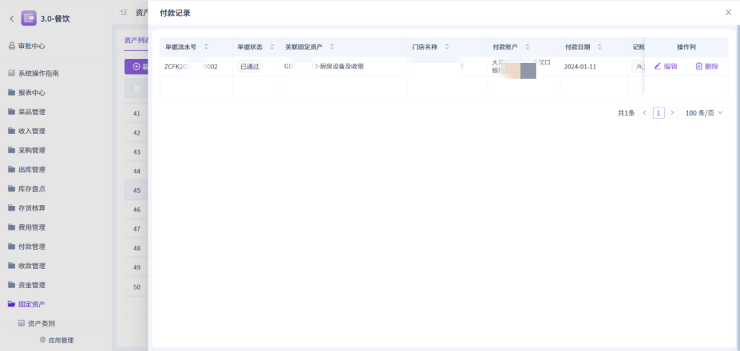 点击付款自动生成对应的资产付款单