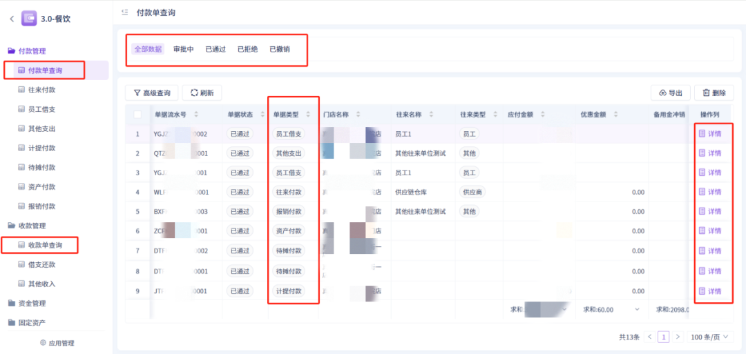 对应查询界面汇总,可查询不同审批状态下的收/付款单