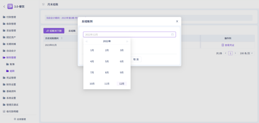 6、月末结账功能支持一次性可跳多个月份跨度进行反结账;