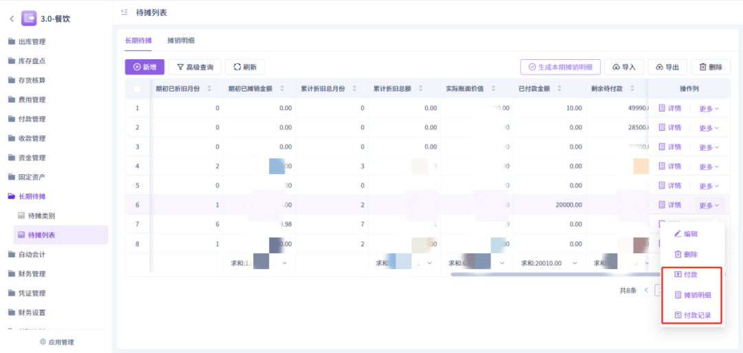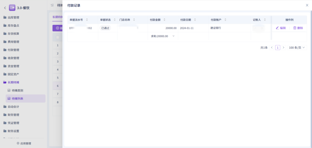 5、长期待摊功能单条数据支出查看往期付款记录、摊销记录,且提供快捷付款按钮;(付款记录须有付款才会显示,摊销记录需摊销才会有显示)