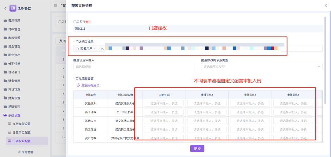 【自动会计、财务管理、收付款单、门店权限设置、门店审批流设置、往来科目设置】