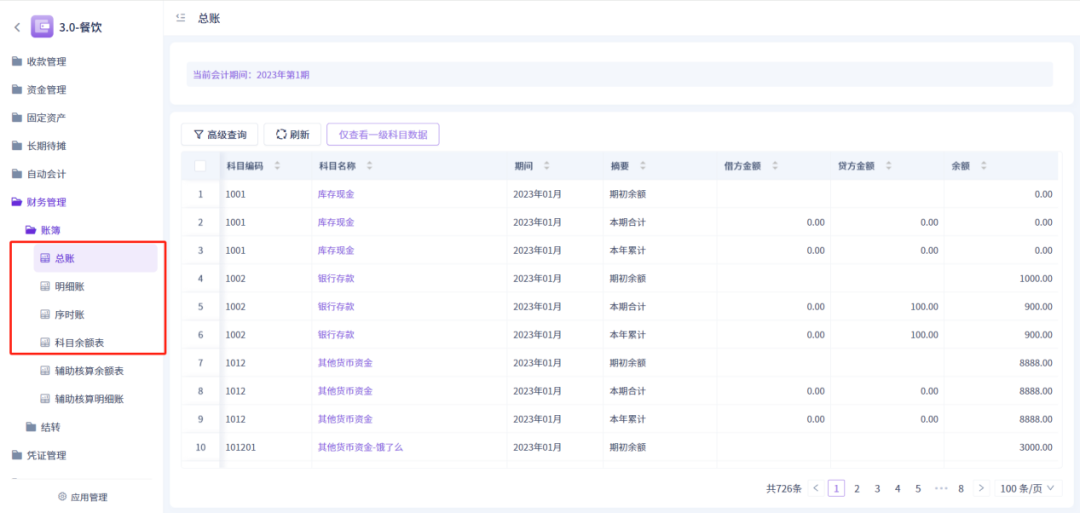 「财务管理」开放财务相关明细数据查询,支持总账、科目余额表、明细账、序时账统计查询