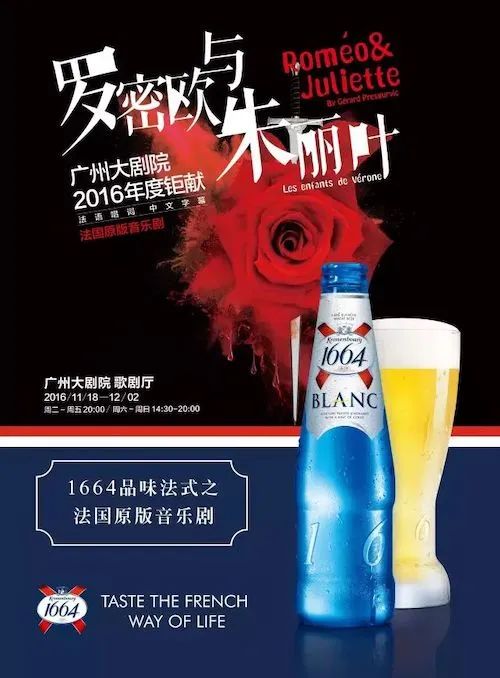 被称为必看音乐剧之一的《罗密欧与朱丽叶》被引入国内后,1664第一时间赞助了广州站场次,并参与前期推广工作。持续的文化营销不仅为1664带来了隐形溢价,也让品牌和产品辐射到相关人群。