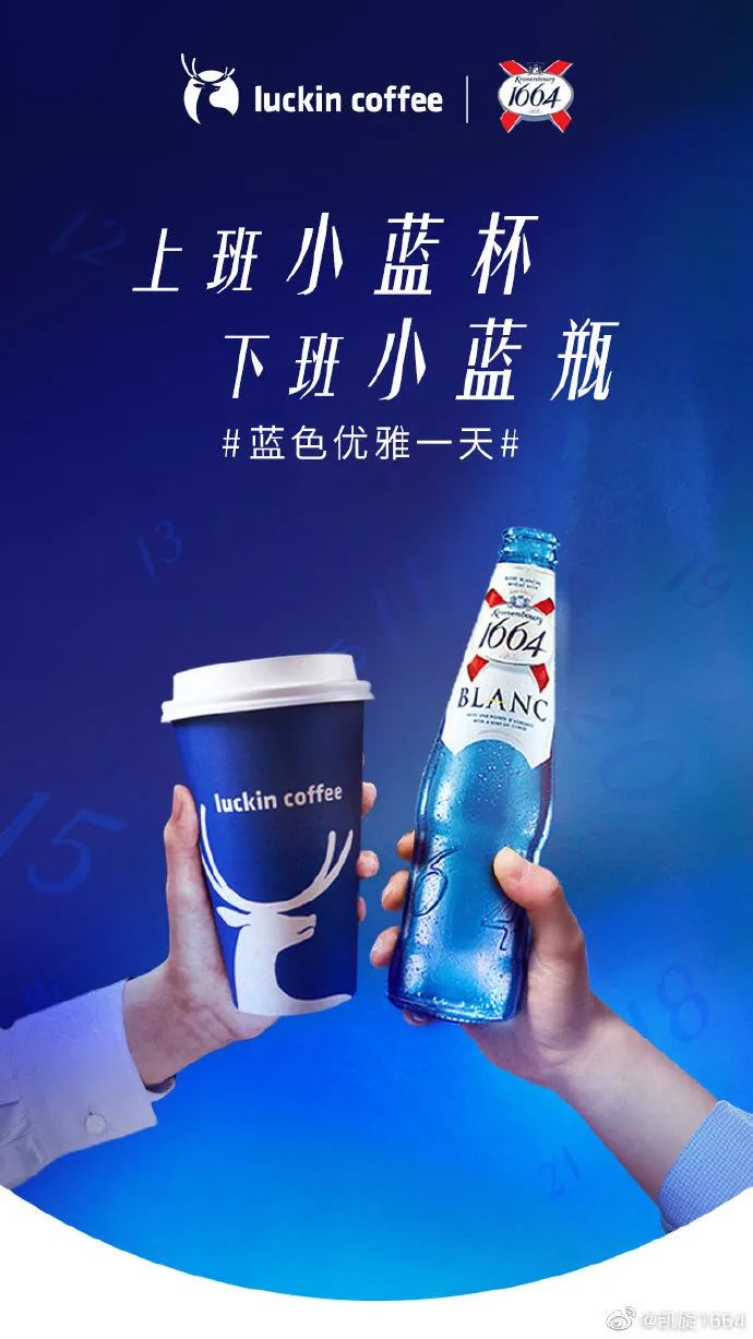 品牌找到当时如日中天的瑞幸,组了次蓝色CP。当时瑞幸的代言人还是张震和汤唯,和有倪妮的1664之间,岂止是般配。也算是最早一批玩日咖夜酒的品牌。1664 × 瑞幸