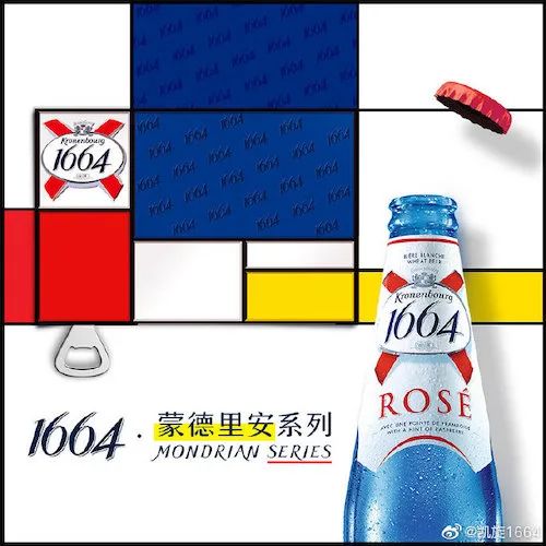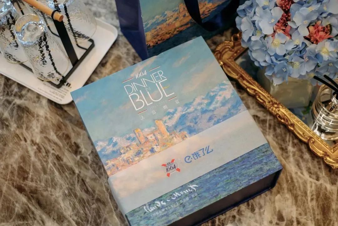 在这之外,品牌围绕产品做了更多艺术尝试。1664在艺术家风格和品牌之间找到了交集——蓝色。现代艺术先驱蒙德里安的黄红蓝象征,以及莫奈那让人无法抗拒的印象派蓝,都成为1664创作联名礼盒时的灵感。