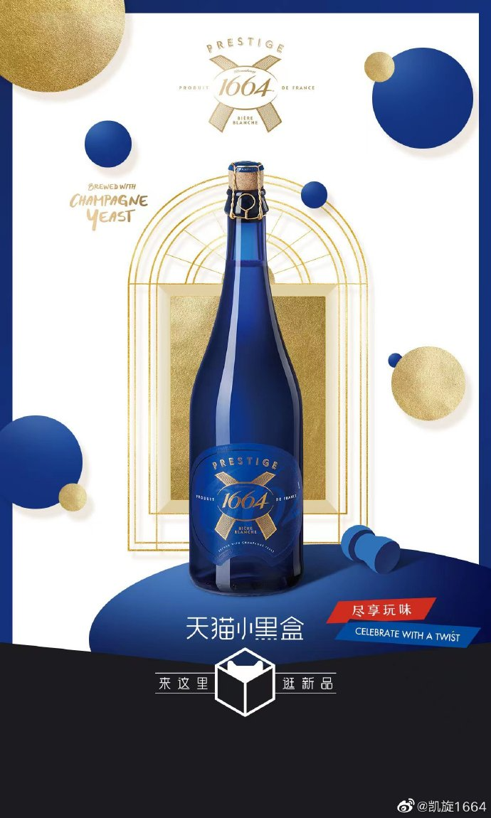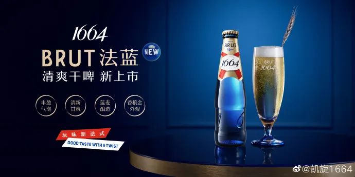 选择酒瓶时,酒厂用了在整个欧洲都有皇室贵族象征意味的蓝色。在以绿或棕瓶为主的年代,不惜用上成本翻倍的蓝色钴玻璃,能看出酒厂对定位的确定和要做品牌的信念感。总的来说,1664在今天打的这张法式牌,经得起溯源与历史考证。摆在它面前的应该是关于未来的命题。拿下高端市场后,明天1664要去往何方?2022年,1664推出全新产品“巴黎之槟”,一款用香槟酵母酿造的白啤。750毫升,标准的香槟规格,定价189元。