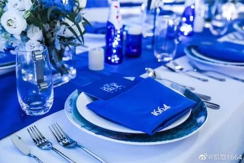 这种资源我们羡慕不来,但是能从中看到一场好的明星营销,其本质是成功借势,美美与共。在这之中品牌更像是一个隐喻,隐喻特定的身份气质。就像依云赞助《欢乐颂》,由高知精英安迪带其出场。难点可能是品牌怎么定义自己,又想让用户怎么想象品牌。与此同时,1664在类似的名利场中会强调色彩营销,不断借「法蓝晚宴」等蓝色效应,释放品牌色影响力,进一步建立小蓝瓶标识。强化品牌色
