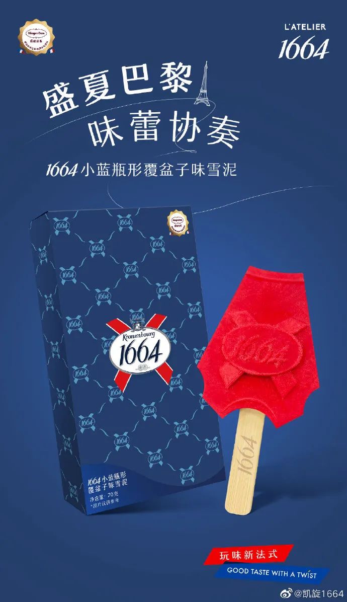 在成都站,1664与当地TOP酒吧喜之HONG‘S LOUNGE打造了联名特调;与哈根达斯合作定制了两款瓶形冰激淋。两个新增玩法的重点很明显,前者提升品牌在酒圈内知名度,后者的受众更广——泛都市时尚人群。1664 × 哈根达斯