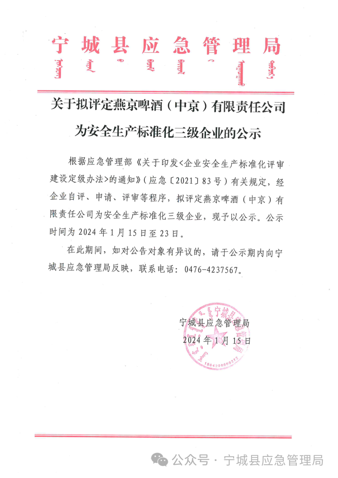关于拟评定燕京啤酒(中京)有限责任公司为安全生产标准化三级企业的公示