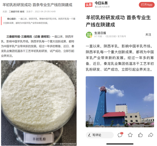 国内首家低温冻干技术羊初乳生产线。三秦都市报和今日头条都进行了专业报道。