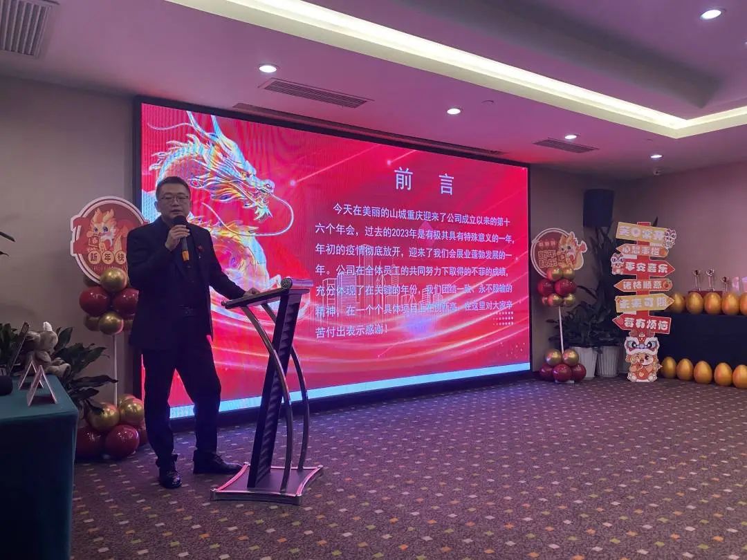 孟总首先对过去一年的工作进行了全面总结。他指出,在过去的一年时间里,疫情初放开,会展行业迎来蓬勃发展。公司在全体员工的努力下取得了不菲的成绩。他强调,这些成绩的取得并非偶然,而是公司在创新、质量和服务等方面不断追求卓越的结果。孟总展望的公司未来的蓝图,他表示面对日益激烈的市场竞争,公司必须保持敏锐的洞察力,不断拓展新领域。他鼓励员工要敢突破、敢超越,为实现公司长远的发展目标贡献力量。孟总还对下一年的工作进行了规划和部署,并在发言的最后,向全体员工和合作伙伴表达了最真挚的祝福。他希望在新的一年里,大家团结一致,携手共进,再创佳绩,共同开创更加美好的未来。