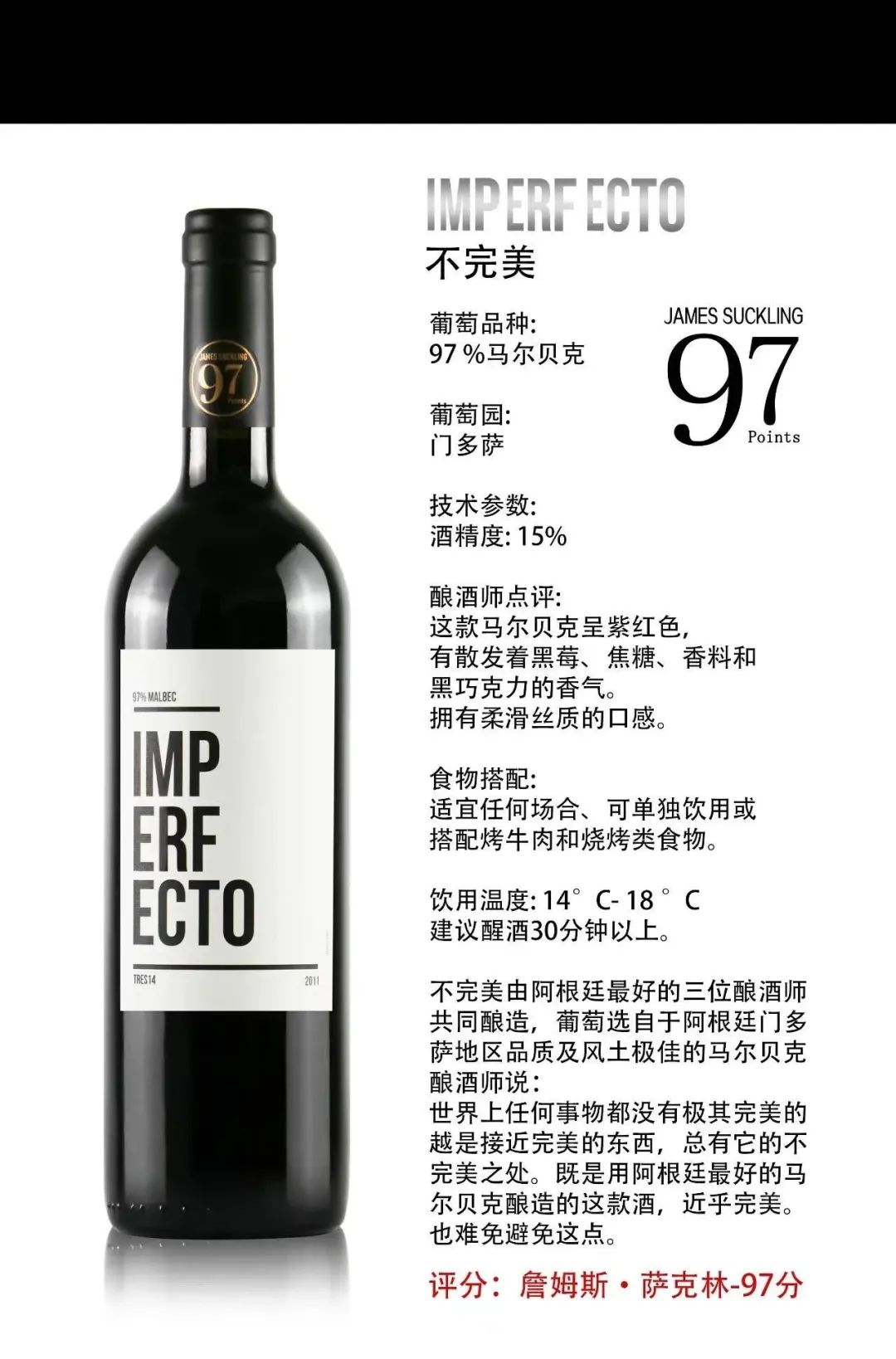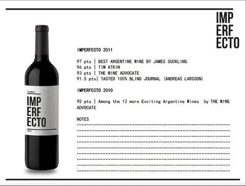 第三款:不完美IMPERFECTO。来自阿根廷拉菲相同产区门多萨产区,口感极佳, 詹姆斯(JAMES)评分97分。详情看下图: