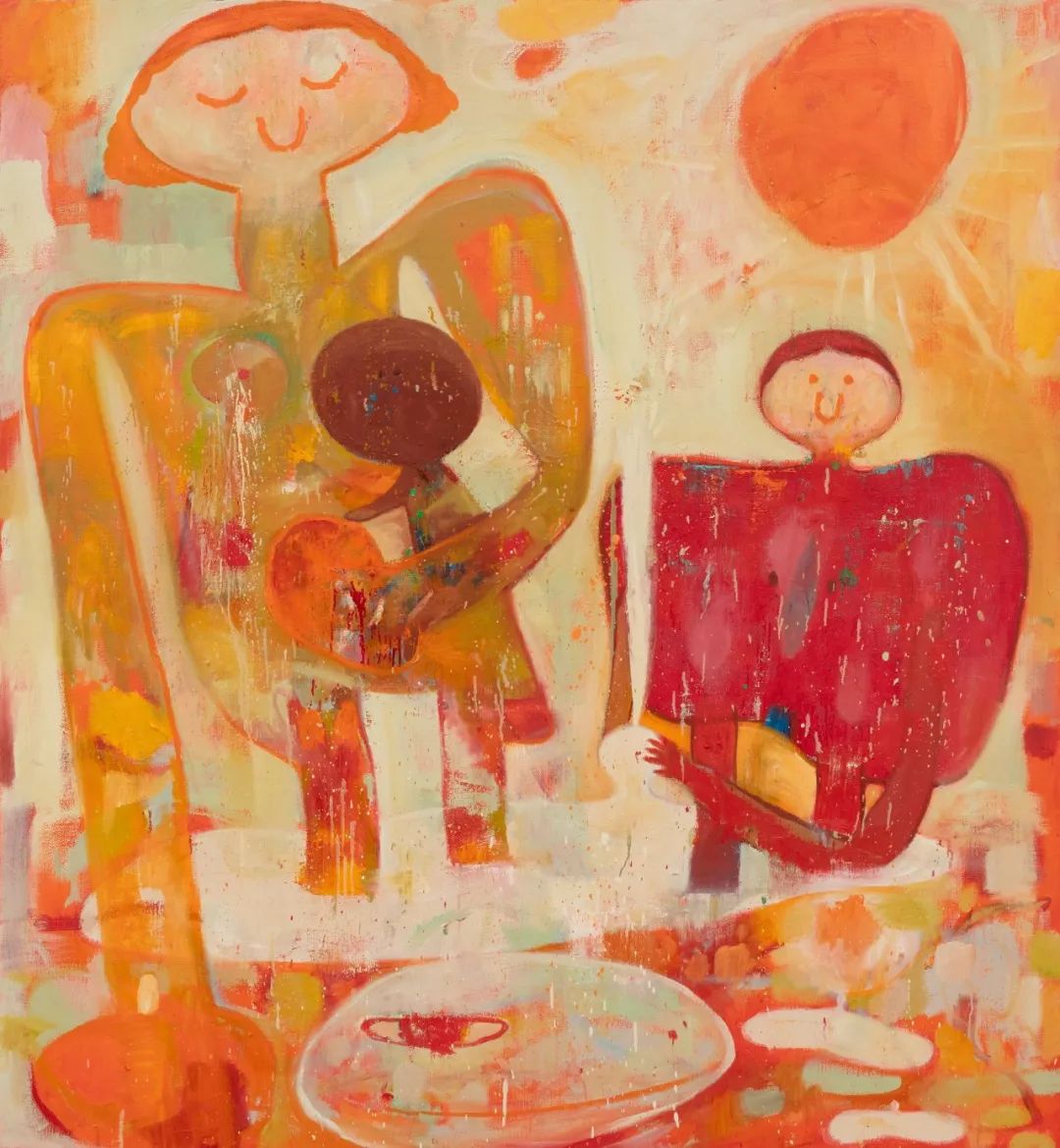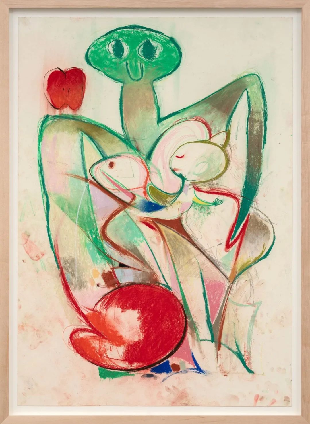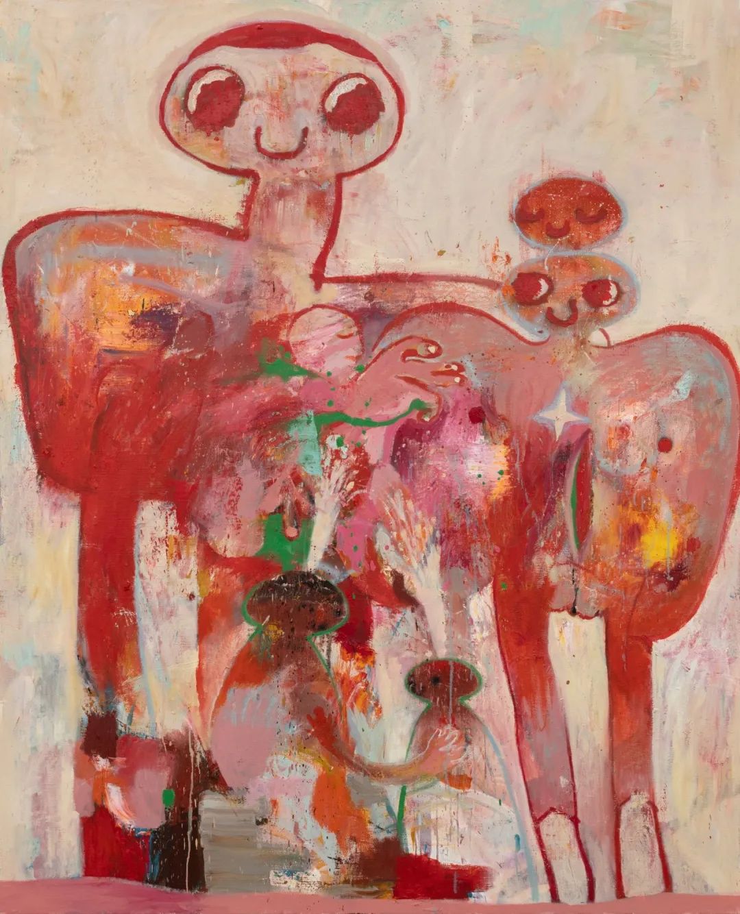 作为一个新成立的家庭,罗比和他的家人,特别是他的妻子和女儿,一起克服了许多困难。在这次展览中,罗比的大多作品都描绘了一个由母亲、父亲和孩子组成的家庭单元。这些画作中的人物通常被刻画成类似成双成对的形状,看似类似母亲乳房,其中一些作品中的描绘甚至看起来像一道喷出的牛奶水柱,或可能是涌动的泉水。我们看到画中再次出现了苹果元素,这次被塑造成人形,愉快地站立着并代表着生活中的简单快乐。每当苹果出现时,罗比就会回想起童年时的记忆,那时在罕见而特殊时刻,父亲便会给他一个冰爽苹果。