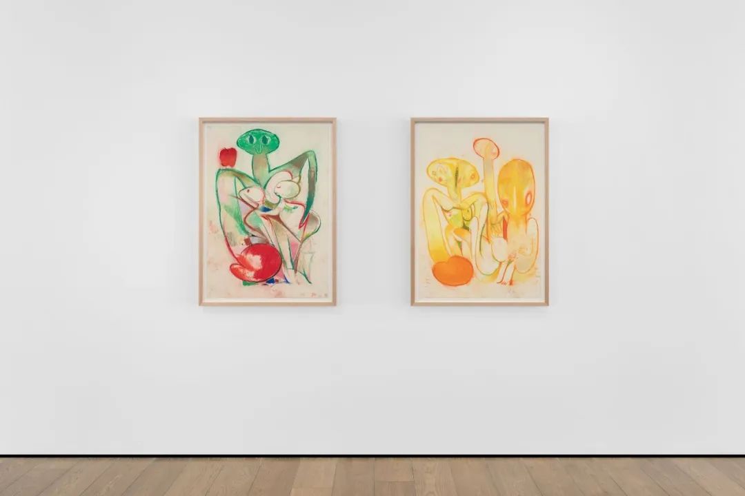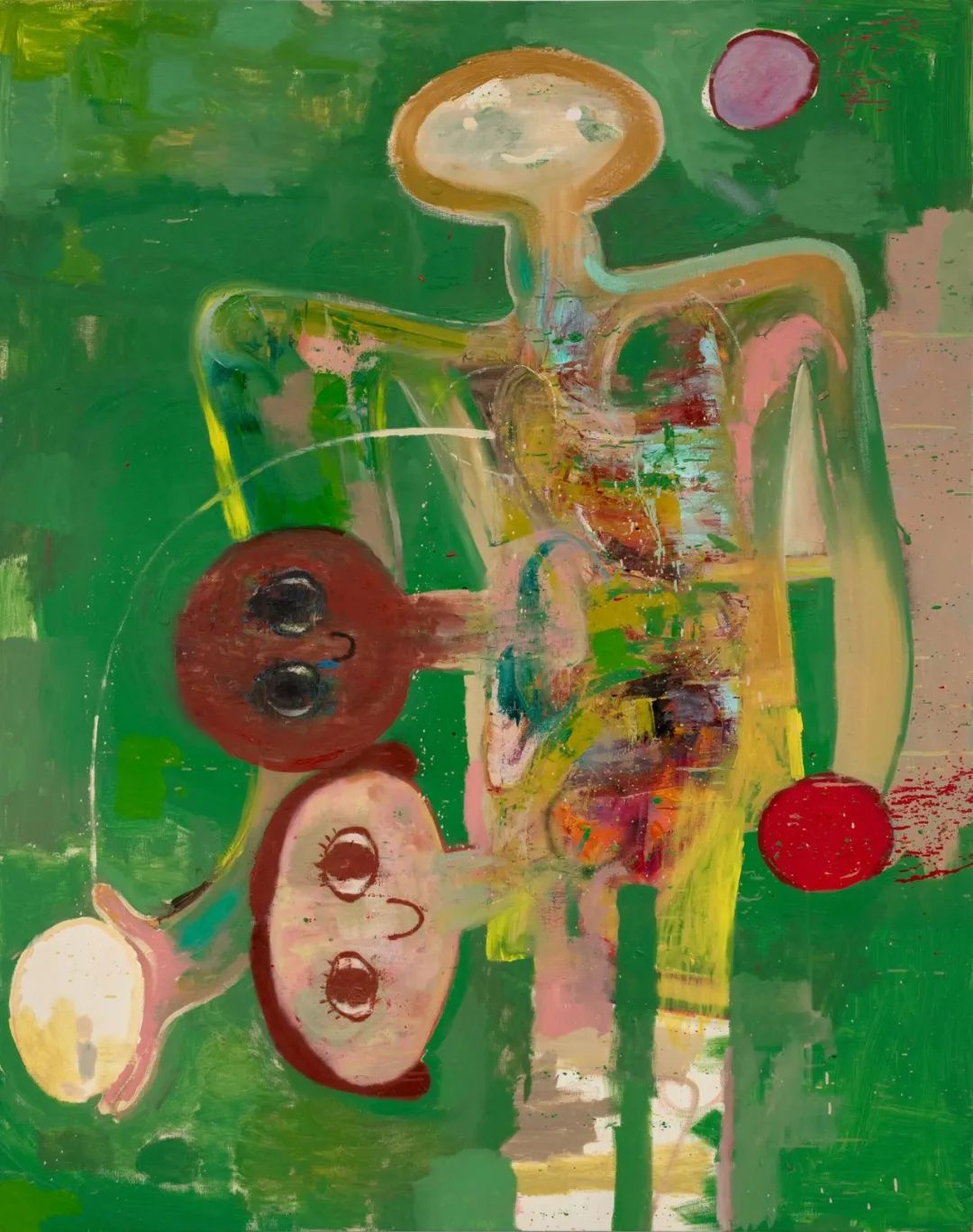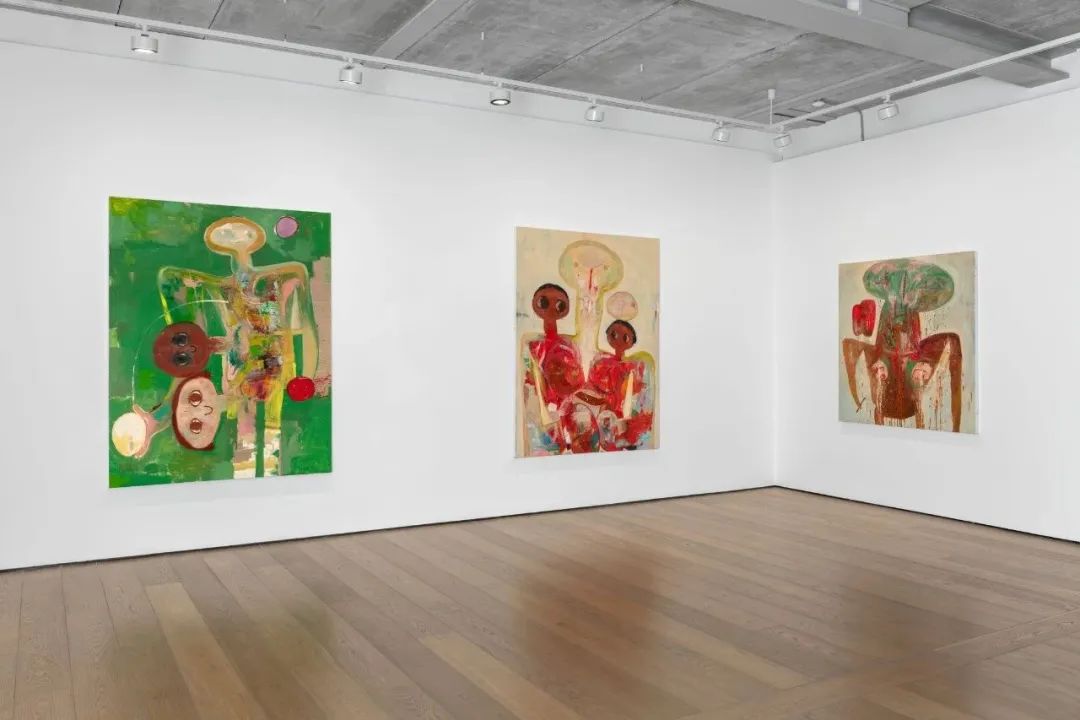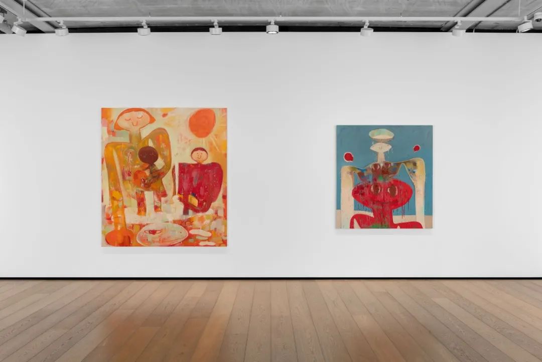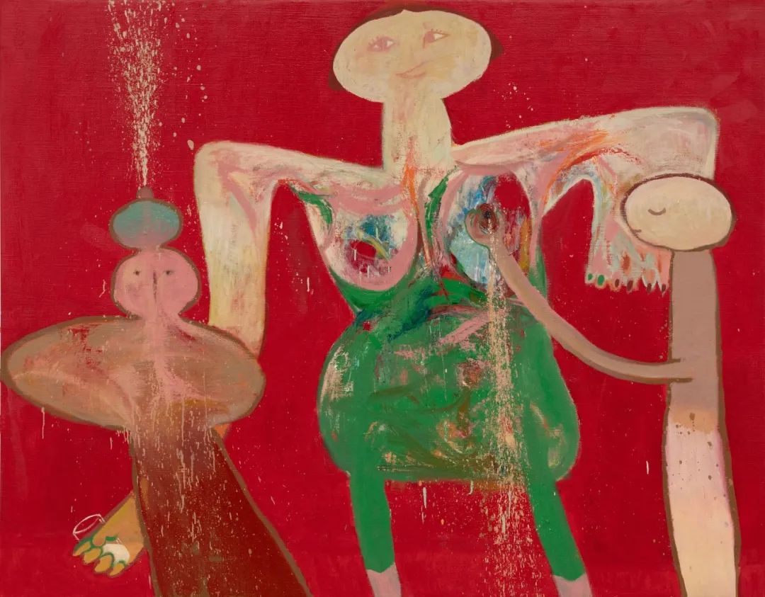 作为一个新成立的家庭,罗比和他的家人,特别是他的妻子和女儿,一起克服了许多困难。在这次展览中,罗比的大多作品都描绘了一个由母亲、父亲和孩子组成的家庭单元。这些画作中的人物通常被刻画成类似成双成对的形状,看似类似母亲乳房,其中一些作品中的描绘甚至看起来像一道喷出的牛奶水柱,或可能是涌动的泉水。我们看到画中再次出现了苹果元素,这次被塑造成人形,愉快地站立着并代表着生活中的简单快乐。每当苹果出现时,罗比就会回想起童年时的记忆,那时在罕见而特殊时刻,父亲便会给他一个冰爽苹果。
