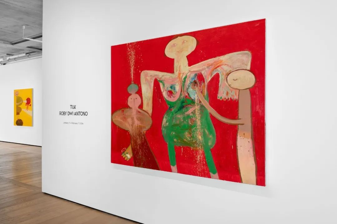 在此次展出的新系列中,虽然经历了与罗比早期作品相比的风格变化,但他从个人记忆中绘画的方法仍然不变。罗比童年记忆源于爪哇中部的安巴拉瓦(Ambarawa),在那里他不得不创造一个名为“Belik”的人造水源,这是一种传统的水井,而“Tuk”则是从井里冒出来的水泉,在这被比作婴孩的母乳体验。90年代的印尼村庄,许多居民负担不起家中的供水设施。每到旱季,当水资源变得稀缺时,村民们采用了传统方法来获取干净的天然地下水。他们需要建造一个“Belik”,这便是在干涸的河流附近的浅区域挖掘,在地下水积聚之前挖到“Tuk”的冒出,一个流动的泉源。村民们将一起以石头和石块蒸馏并过滤浑浊的水,直到水中杂质被滤净。