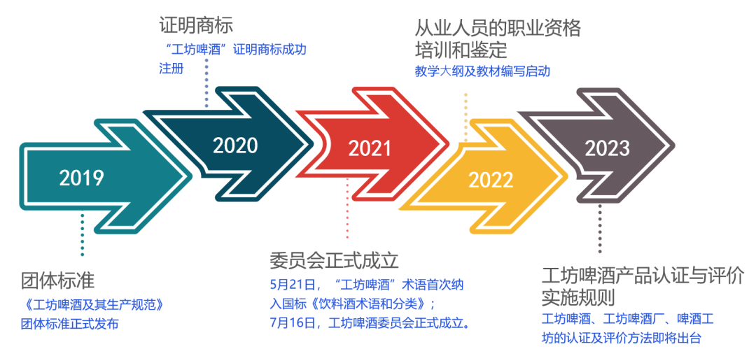 中国酒业协会啤酒分会及工坊啤酒专业委员会长期致力于建立工坊啤酒行业的规范化发展。从2019年制定、发布、实施和宣贯《工坊啤酒及其生产规范》团体标准;到建议《产业政策指导目录》删除啤酒业限制类和淘汰类相关条款;将工坊啤酒生产许可审查细则审查单元;再到申请注册“工坊啤酒及英文及图形”证明商标:2019年,为进一步规范工坊啤酒行业发展,保护工坊啤酒的特定品质,保障消费者利益,协会于2019年正式开展“工坊啤酒及英文及图形”证明商标申请工作,并于2021年4月正式完成注册。2021年7月,在工坊啤酒专业委员会成立大会上,“工坊啤酒及英文及图形”使用管理规则正式发布。