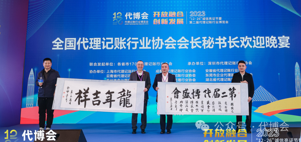 文艺节目表演结束后,天津市中小企业会计服务行业协会秘书长刘津玉为第二届代博会组委会赠送了两幅精美的书法作品《第二届代博盛会》和《龙年吉祥》。