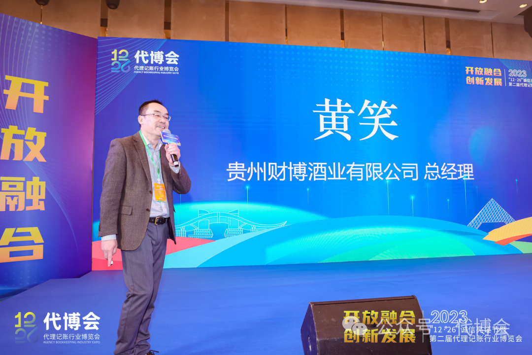 之后,欢迎宴会赞助商贵州财博酒业有限公司总经理黄笑上台分享,向与会嘉宾简要介绍了公司概况和产品特色,并预祝第二届代博会圆满成功。