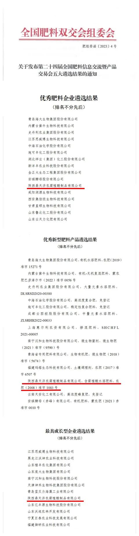 陕西鼎天济农腐殖酸制品有限公司入围“优秀肥料企业百强”、“优秀新型肥料产品(含腐植酸水溶肥料,农肥(2008)准字1083号)百强”、“最具成长型企业百强”。