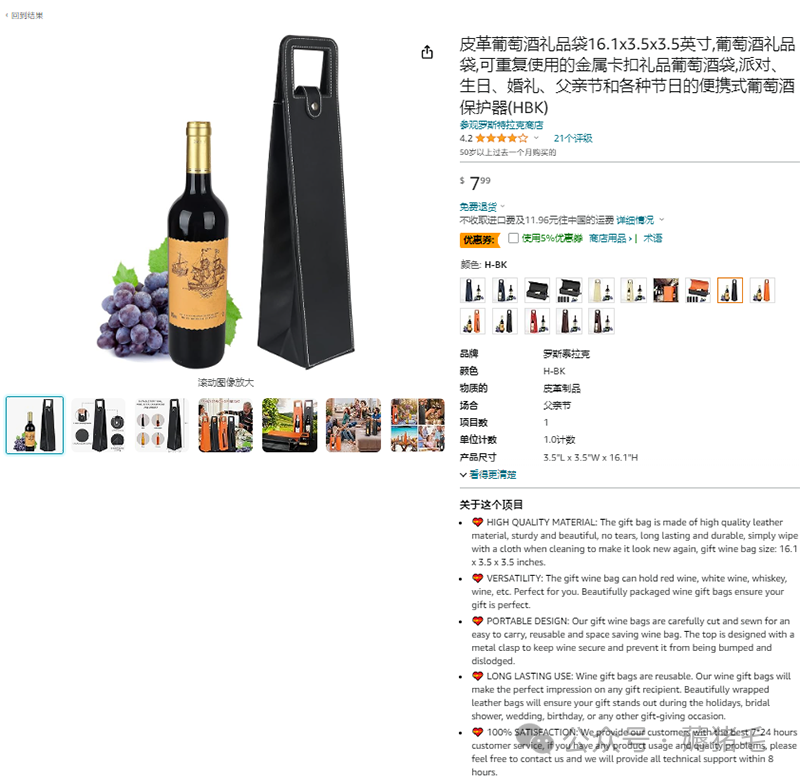 跨境电商出欧美的高品质皮革葡萄酒红酒礼品袋,外网单支装的酒袋售价都要7.99美元了,我们这个酒袋还是双支装的,内部有个酒档设计,可以有效防止两瓶酒相互碰撞,保护酒瓶安全,档片可折叠不占空间。一般红酒都没有礼袋,所以送礼的时候很麻烦,总不能一手拿一支,显的太俗气,再贵的酒也变的平价,有咱这礼袋就不一样了,瞬间提升档次,多囤几个吧,主要一般几年才能碰到一批这种冷门库存,错过了实在可惜!礼品袋是由高品质的PU皮革材料制造,坚固美观,持久耐用,只需用抹布擦拭去清洁。礼品酒袋可装红酒、白酒、威士忌、葡萄酒等,便携式设计,此款礼品酒袋都经过精心切割和缝制,便于携带,可重复使用和节省空间的酒袋。顶部设计有一个金属扣,可以保持葡萄酒的安全,防止它被撞到和移位。包装精美的手提酒袋会让您的礼物在假期、新娘送礼会、婚礼、生日或任何其他送礼场合中脱颖而出。