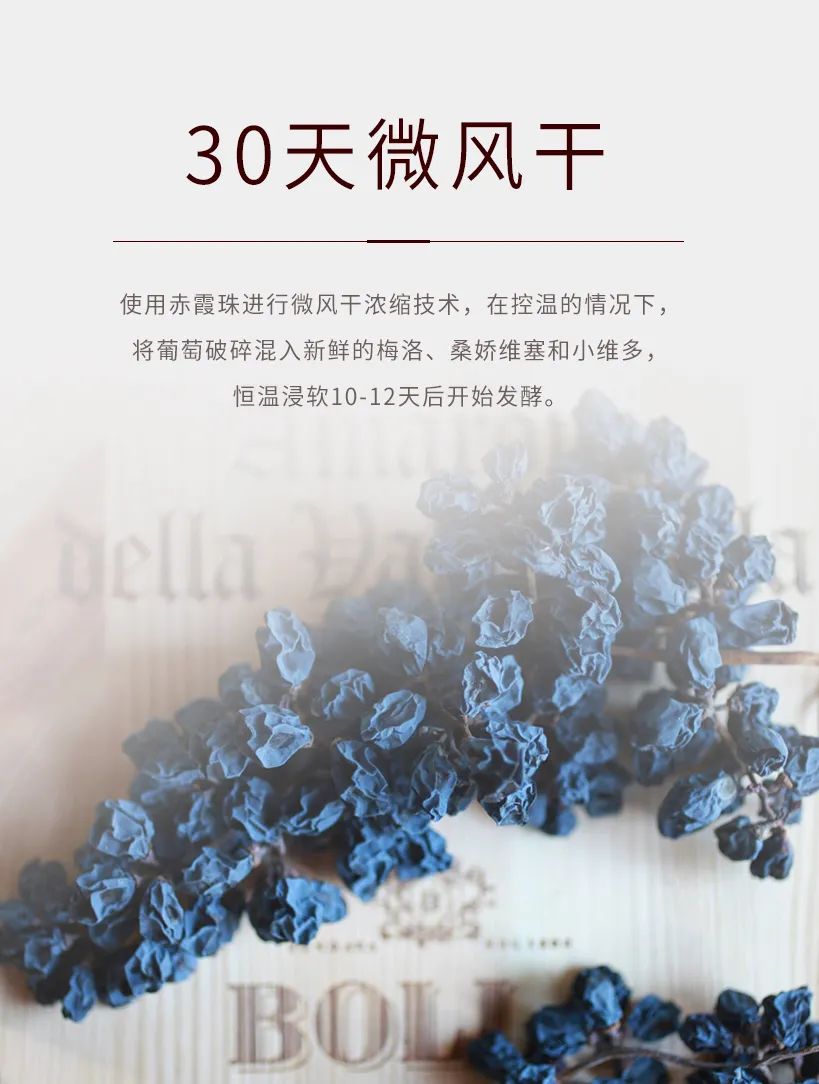 30天微风干,使用赤霞珠进行微风干浓缩技术,在控温的情况下,将葡萄破碎混入新鲜的梅洛、桑娇维塞和小维多,恒温浸软10-12天后开始发酵。
