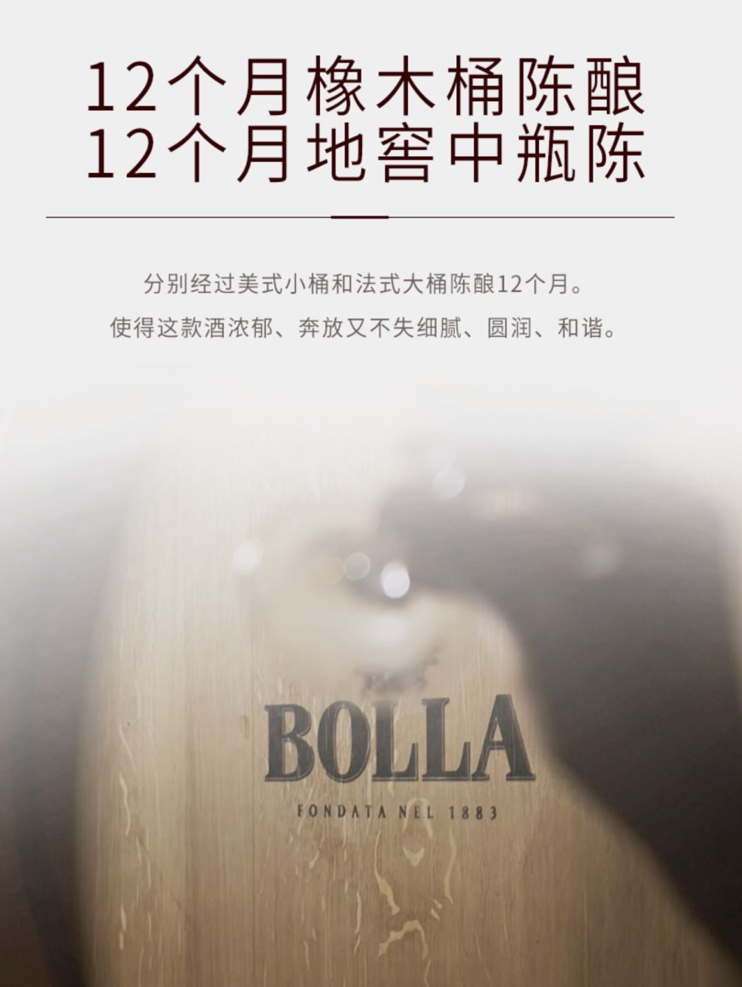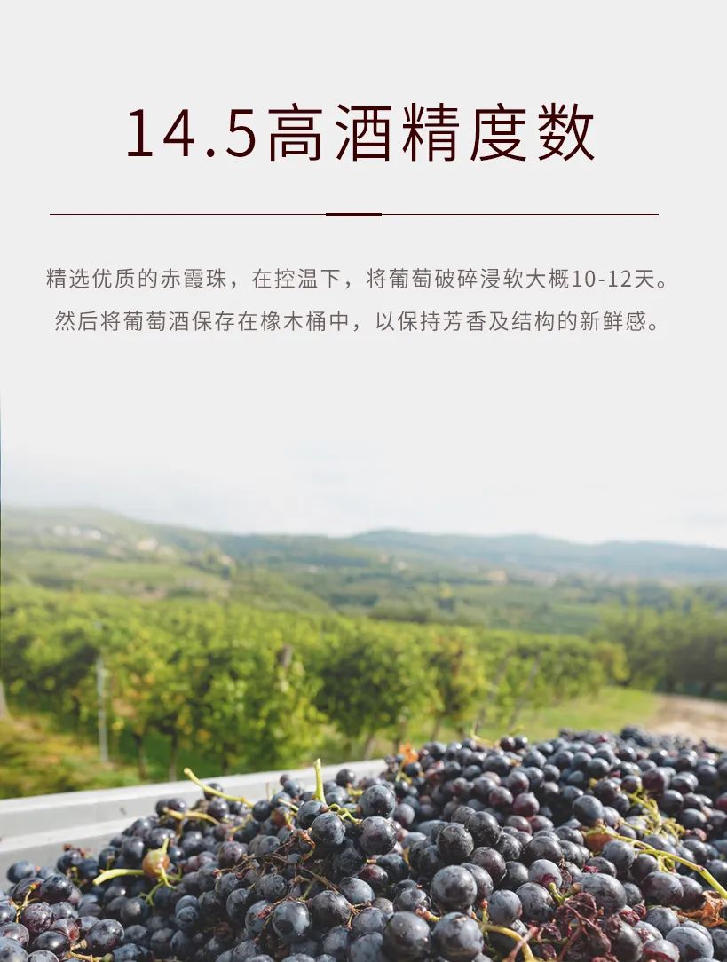 12个月橡木桶陈酿,12个月地窖中瓶陈,分别经过美式小桶和法式大桶陈酿12个月。使得这款酒浓郁、奔放又不失细腻、圆润、和谐。