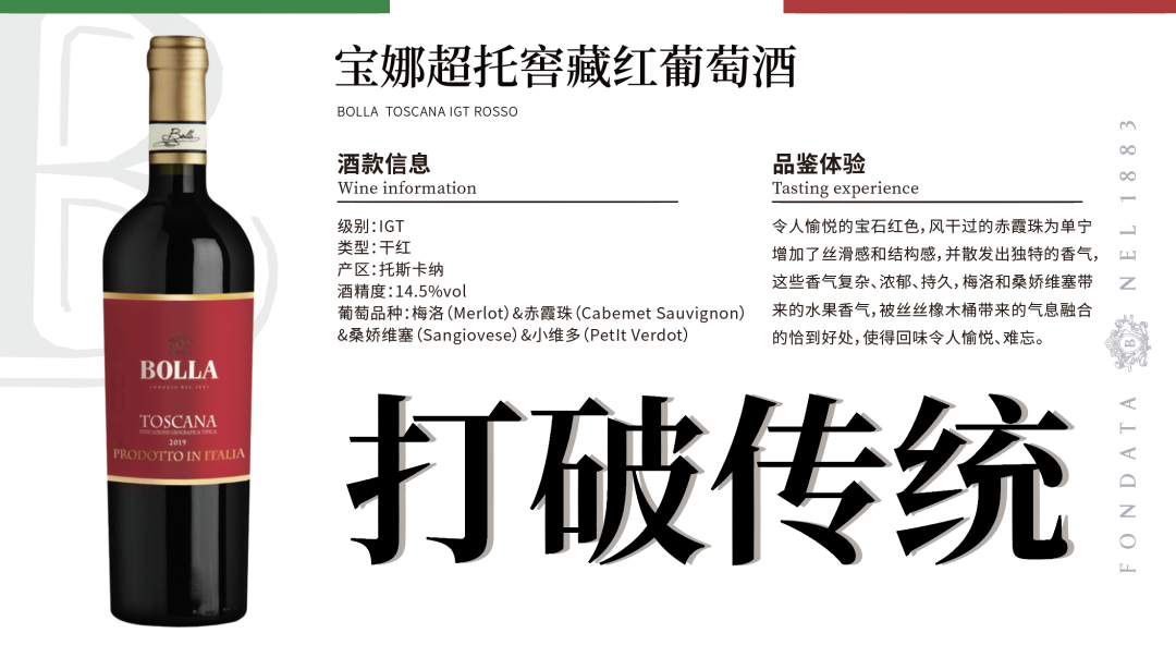 “超托”是SUPER TOSCANA的缩写,专指不拘一格的酿酒师在托斯卡纳产区,打破束缚、勇于创新并在国际上深受欢迎的酒款。宝娜的超托在创新中不但大胆的使用了众多国际葡萄品种,而且融入了宝娜酒庄名扬天下的五道浓缩酿造工艺,使得这款酒浓郁、奔放又不失细腻、圆润、和谐。