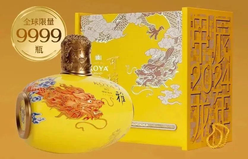张裕另一大“招牌产品”,张裕可雅白兰地则联手国瓷永丰源,以清乾隆官窑作品青花矾红苍龙教子祥云海水纹梅瓶为灵感,将东方神龙与可雅龙舶相结合,打造了一款结合中国传统瓷器文化和生肖文化的一款XO级别的生肖纪念酒。
