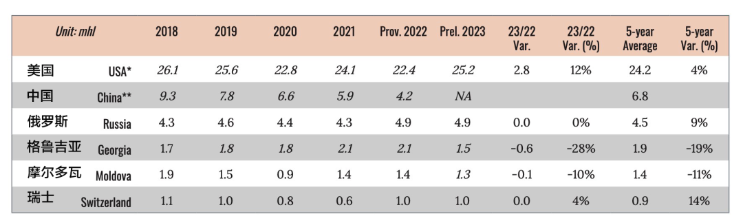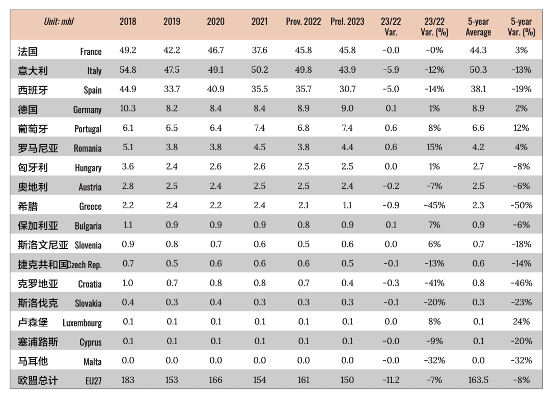 ·预计欧盟的产量会很低。与2022年相比,由于不利的天气条件引起霜霉病和干旱,意大利和西班牙的产量大幅下降。法国成为2023年最大的葡萄酒生产国,产量略高于其五年平均水平。