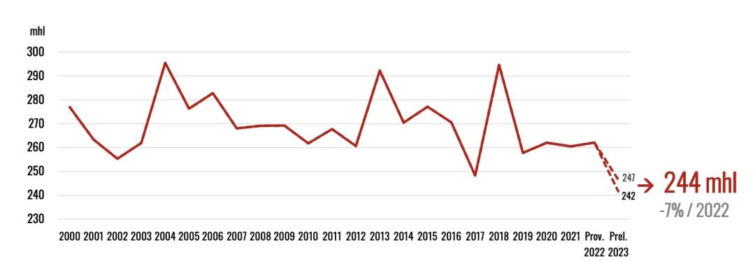 从收集到的29个国家(占2022年全球产量94%)信息来看,2023年全球葡萄酒产量(不包括葡萄汁和葡萄醪)估计在241.7亿升(mhl)至246.6亿升(mhl)之间,均值大约为244.1亿升(mhl)。与已经低于平均水平的2022年相比,这一数字下降了7%。