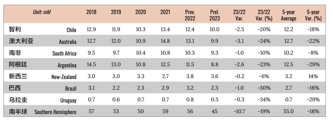 ·南半球的葡萄酒产量预计将远低于2022年。澳大利亚、阿根廷、智利、南非和巴西都受到恶劣天气条件的严重影响。新西兰是唯一的例外,2023年产量高于其五年平均水平。