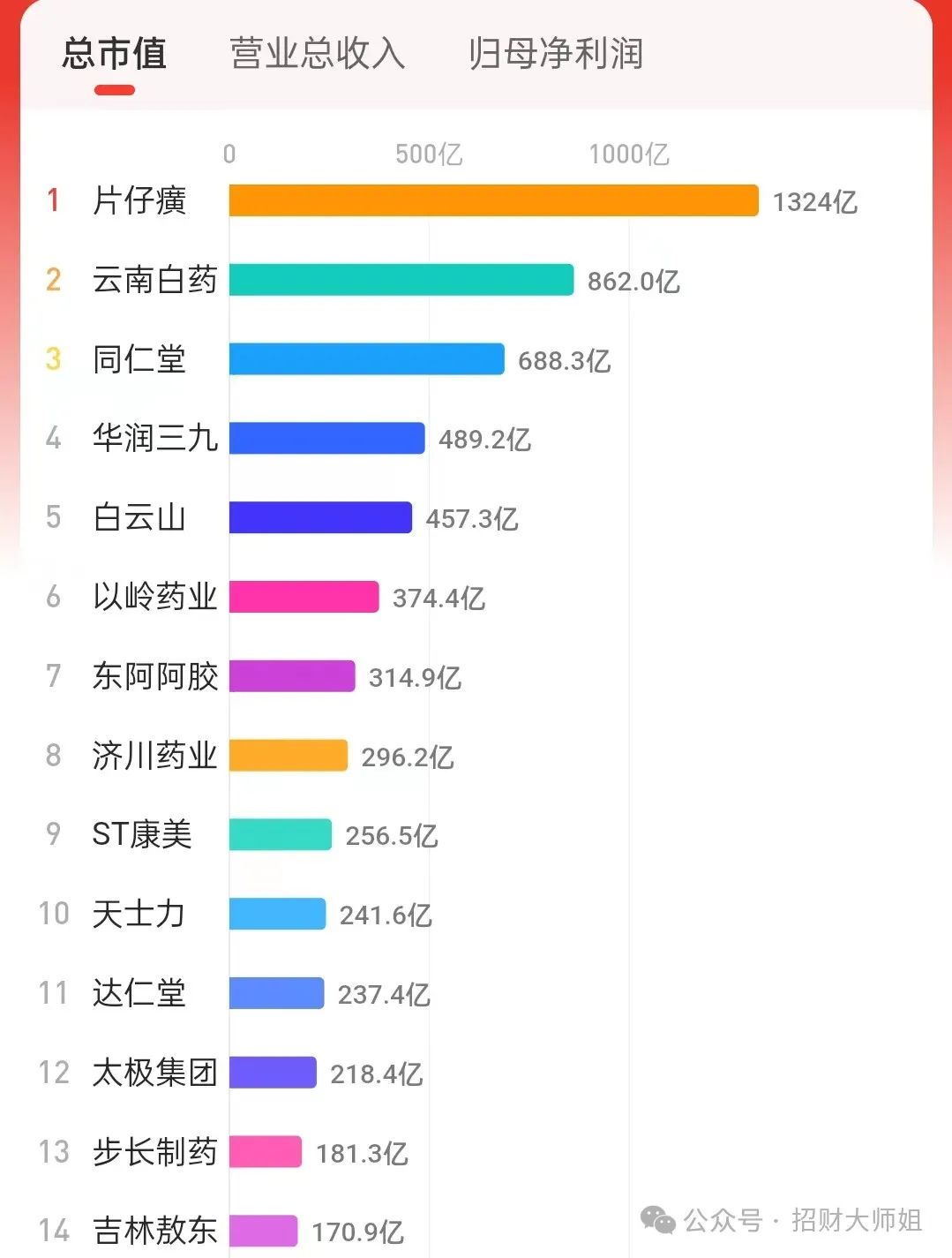 现在的中药市值都非常小,都是小婴儿,白酒已经是中年人了,同等条件下,能配置中药就不要配置白酒了!现在的中药大部分都是几百亿市值,最大市值只有片仔癀是1324亿,云南白药800亿,白酒最大市值有2万亿了,差距太大了!中药未来也有万亿市值的公司哦!现在的几百亿会增长到几千亿,几千亿会增长到万亿。大家拭目以待!