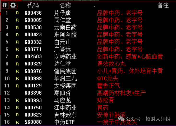 其实师姐的中药池子跟上面的市值排序是差不多的,下图是师姐的中药池子股,大家一起参考: