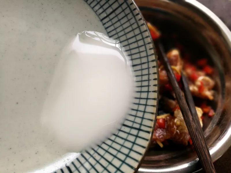 7.淀粉加水勾芡,并混入排骨中,翻拌均匀。